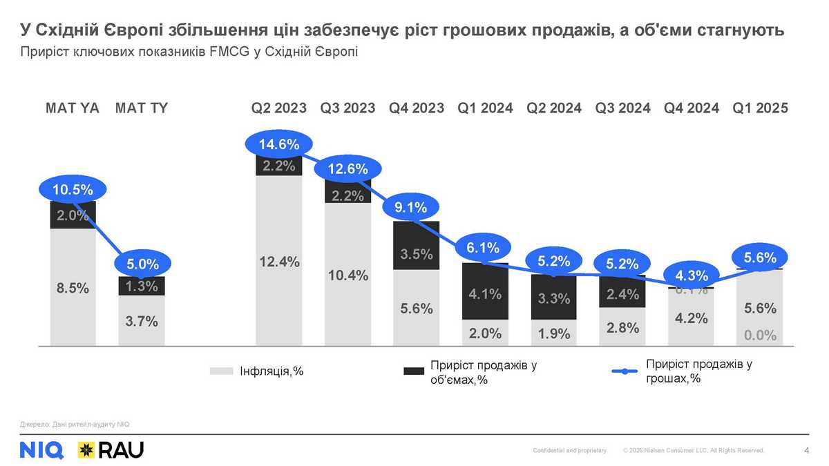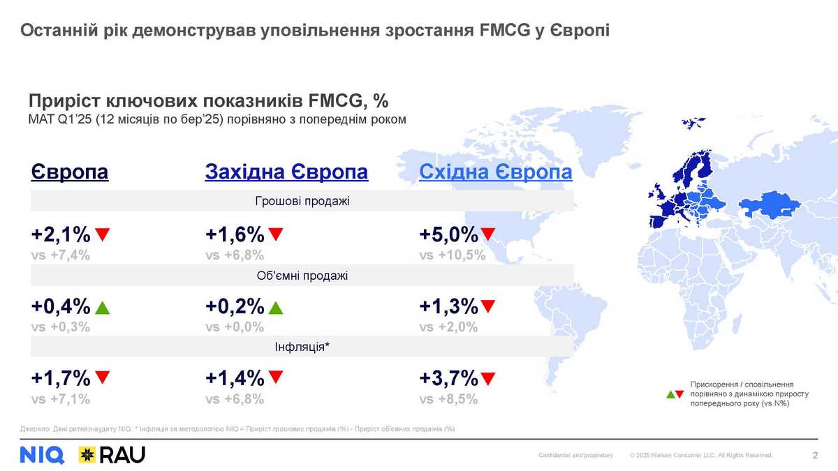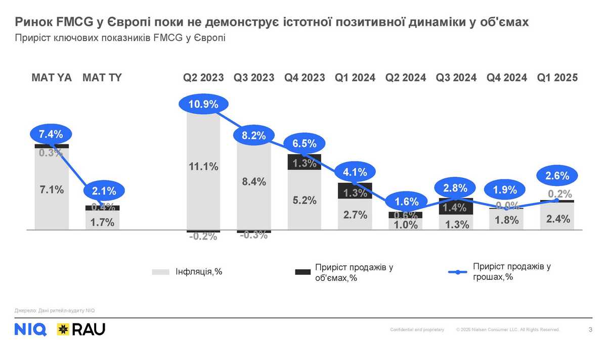 Останній рік демонстрував уповільнення зростання грошових продажів FMCG у Європі. Якщо у квітні 2023-березні 2024 ріст у регіоні складав понад 7%, то вже роком пізніше – усього +2.1%. Навіть попри незначну позитивну динаміку об’ємів, як і раніше, основним драйвером зростання залишається збільшення цін.