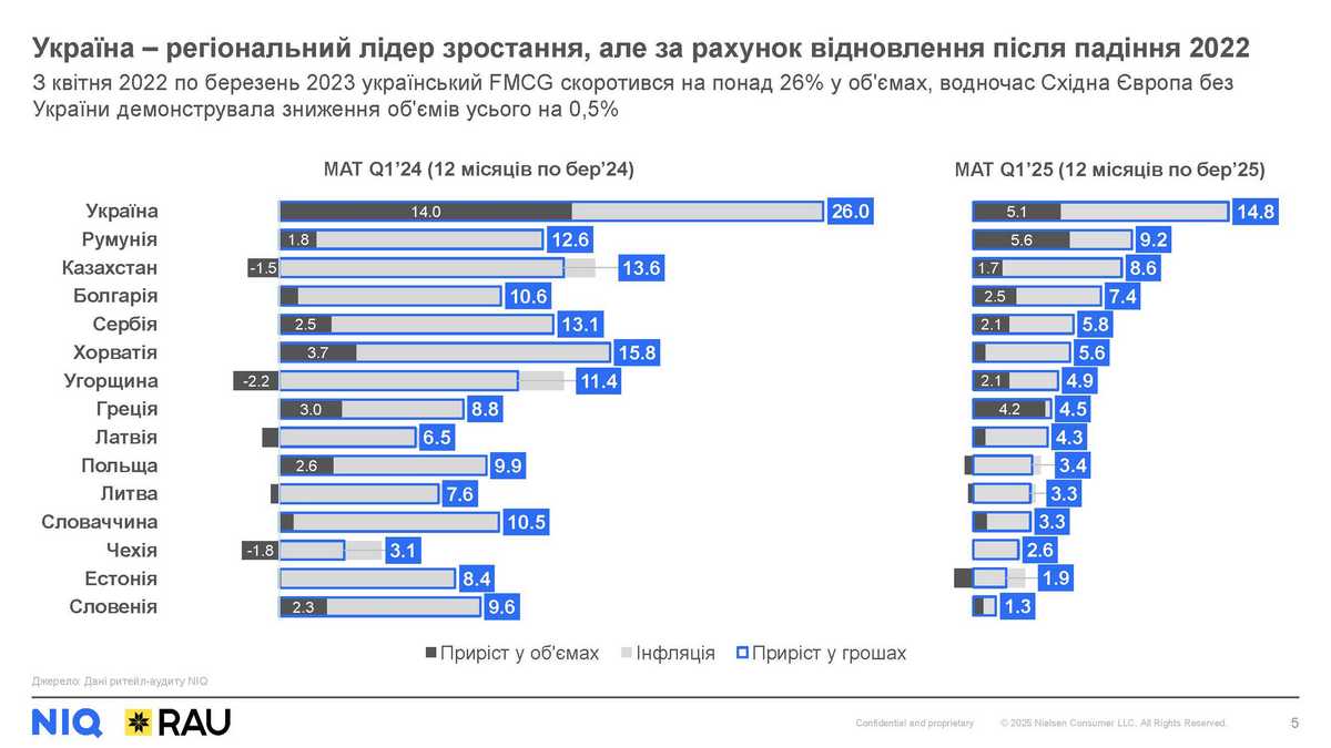 Україна є східноєвропейським регіональним лідером за темпами зростання, однак ці показники досягаються за рахунок ефекту низької бази після різкого падіння у 2022-му. Інші країни демонструють сповільнення річної динаміки: якщо минулого року деякі з них мали двозначне зростання продажів, то наразі жодна, крім України, не перетнула позначку у +10%.
