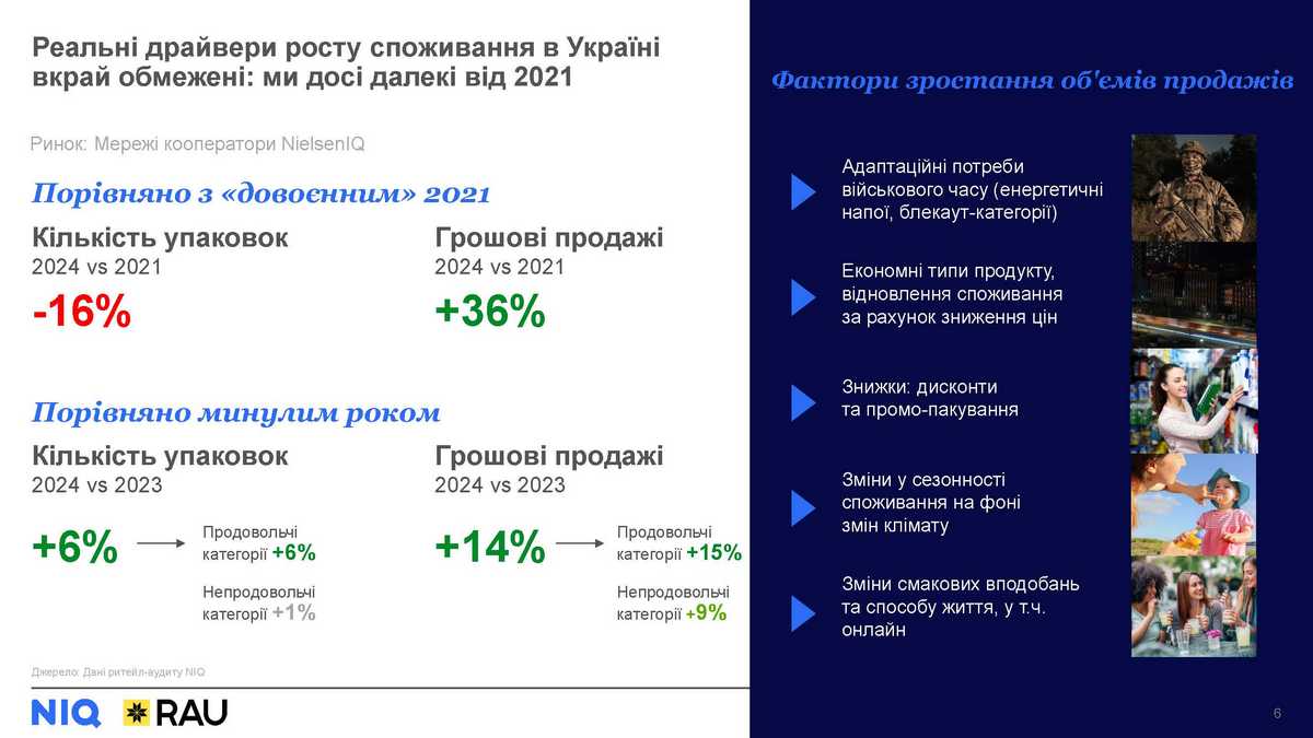 Повномасштабне вторгнення безпосередньо вплинуло на ринок FMCG, особливо за рахунок скорочення населення. На даних мереж кооператорів NielsenIQ ми досі бачимо суттєве відставання ринку: -16% упаковок у календарному 2024-му порівняно з 2021-м. Однак, український ринок усе ж показує певну позитивну динаміку, яка забезпечується передусім продовольчими категоріями. Серед факторів, що підтримують позитивну динаміку продажів: