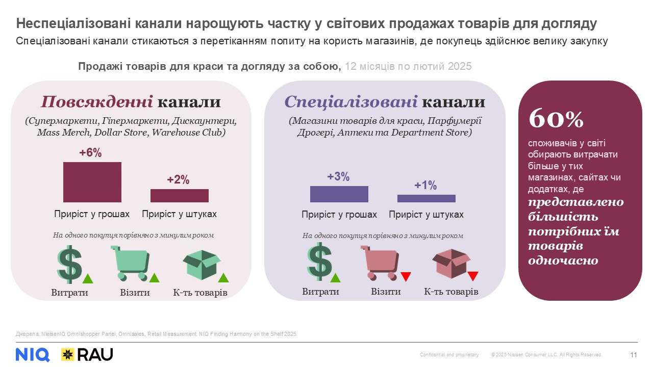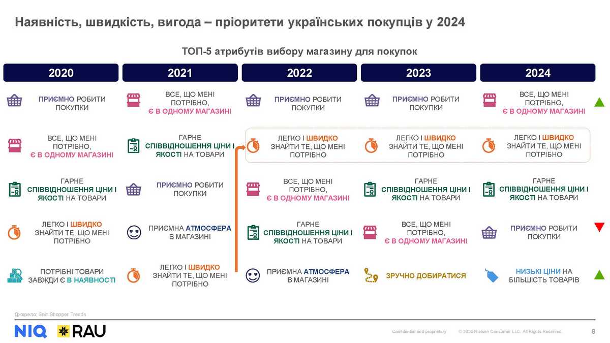 Доступність, швидкість та вигода – основні пріоритети українських покупців при виборі магазину для здійснення покупок товарів FMCG. З одного боку, покупець усе більше орієнтується на критерій наявності усіх необхідних товарів у одному магазині. При цьому, надзвичайно важливою є також швидкість і легкість навігації, і звісно ж – співвідношення ціни та якості. До речі, у світі аналогічно більшість покупців готові витрачати більше у магазинах (як офлайн, так і онлайн), де можна купити якомога ширший перелік категорій. Такі вподобання та зусилля grocery мереж щодо розширення непродовольчої полиці зокрема спричинили перетікання частини продажів товарів для краси та догляду зі спеціалізованих у неспеціалізовані канали.