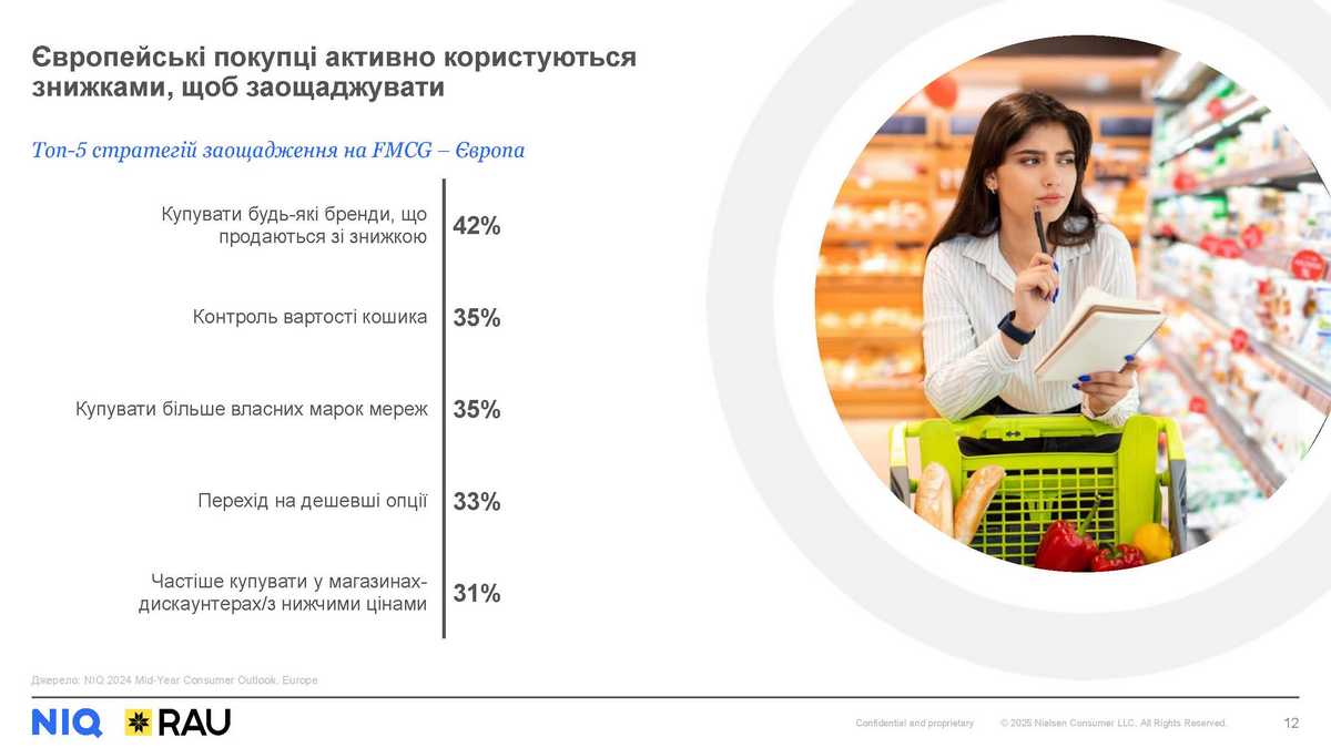 Основними стратегіями заощадження на покупках товарів повсякденного вжитку серед європейських покупців є купівля товарів зі знижкою, контроль сумарної вартості чеку, збільшення споживання власних марок мереж.
