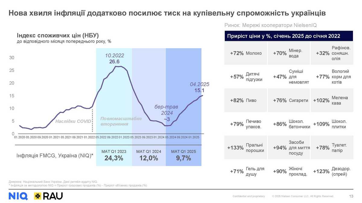 У 2025 році економіка України увійшла у нову хвилю інфляції, яка вкотре вдарила по купівельній спроможності громадян. Порівнюючи із початком 2022 року, на кінець 2024-го ціни на деякі групи товарів майже подвоїлися, а на деякі – зросли на понад 100% (мелена кава, шоколадні плитки, пральні порошки, дезодоранти-спреї).