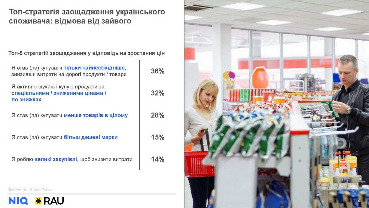 У відповідь на зростання цін товарів FMCG українці найчастіше раціоналізують свій споживчий кошик, відмовляються від зайвого на користь базових найнеобхідніших продуктів. Також серед найпопулярніших стратегій економії – купівля зі знижкою і зменшення загального обсягу покупок.