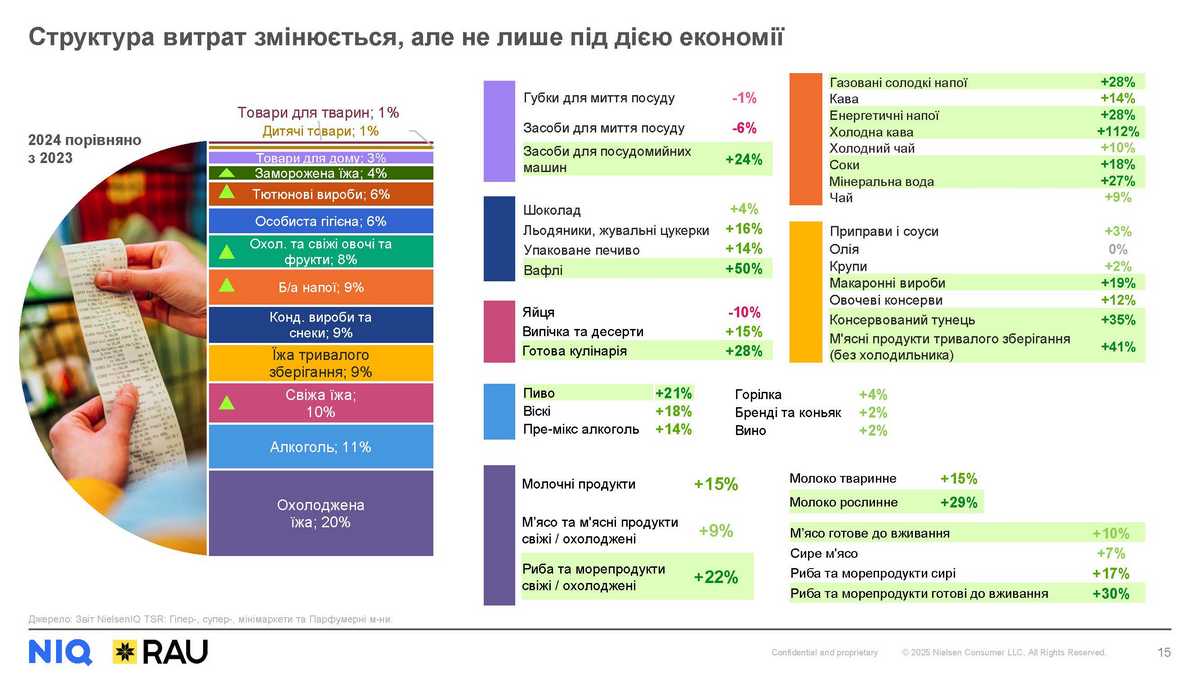 На перший погляд, раціоналізація споживання мала б викликати істотне зміщення у структурі FMCG кошику на користь дешевших, найбазовіших товарів. І дійсно, ми бачимо зменшення частки алкоголю та кондитерських виробів і снеків у витратах, а наприклад, на фоні різкого здорожчання шоколаду, витрати перерозподілилися на користь нешоколадних кондитерських виробів. Однак, у 2024 ми побачили й деякі менш очевидні тенденції, наприклад: