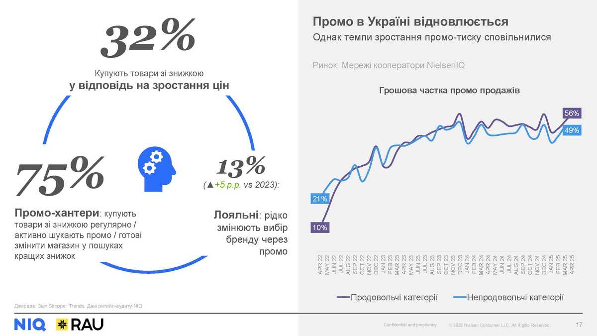 Купівля товарів зі знижкою є однією з найуживаніших стратегій заощадження українців у відповідь на зростання цін. 75% покупців регулярно купують, активно шукають знижки, або навіть готові змінювати звичний магазин на той, де привабливіші промо. Невелика група (13%), однак вона демонструвала зростання – лояльні покупці, які рідко змінюють вибір бренду під дією промо. При цьому частка продажів, що проходять зі знижкою, поступово збільшувалася з моменту її падіння у перші місяці вторгнення і наразі виглядає, наче вже виходить на плато. Фактично, близько половини усієї виручки генерується товарами зі зниженою ціною.