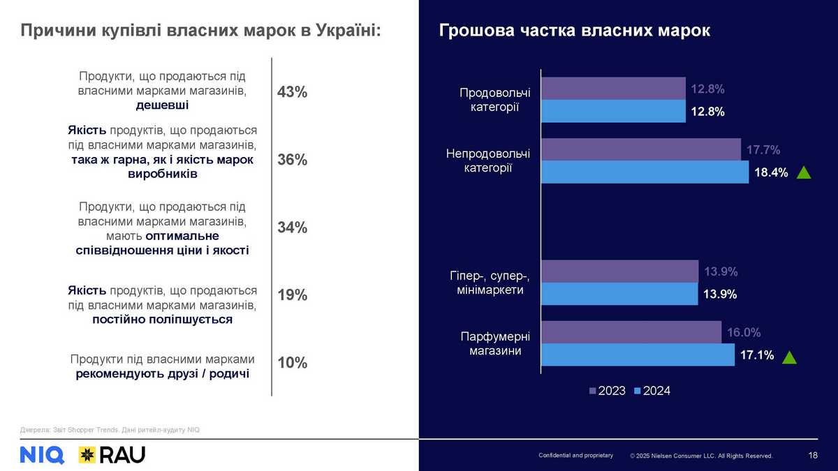 Власні марки мереж (ВТМ) – ще один інструмент заощадження для покупців. В Україні низька ціна є найпопулярнішою причиною купівлі ВТМ. Однак при цьому покупці також відзначають порівнювану якість таких продуктів із брендовими конкурентами та поступове її покращення. Проте у 2024 році частка ВТМ зросла лише у непродовольчих категоріях за рахунок парфумерних магазинів, а частка у продовольчих категоріях поки залишається стабільною.