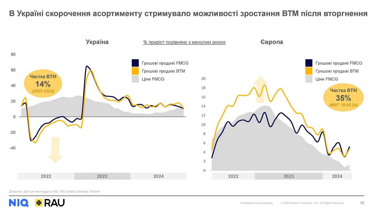 Важливим фактором, який обмежував зростання частки ВТМ в Україні, особливо на початку повномасштабної війни, був асортимент: для власних марок мереж скорочення було більшим, ніж для інших брендів. Водночас, у Європі ВТМ у відповідь на ріст цін зростають і укріплюють позиції, стримуючи негативний вплив інфляції на об’єми споживання.