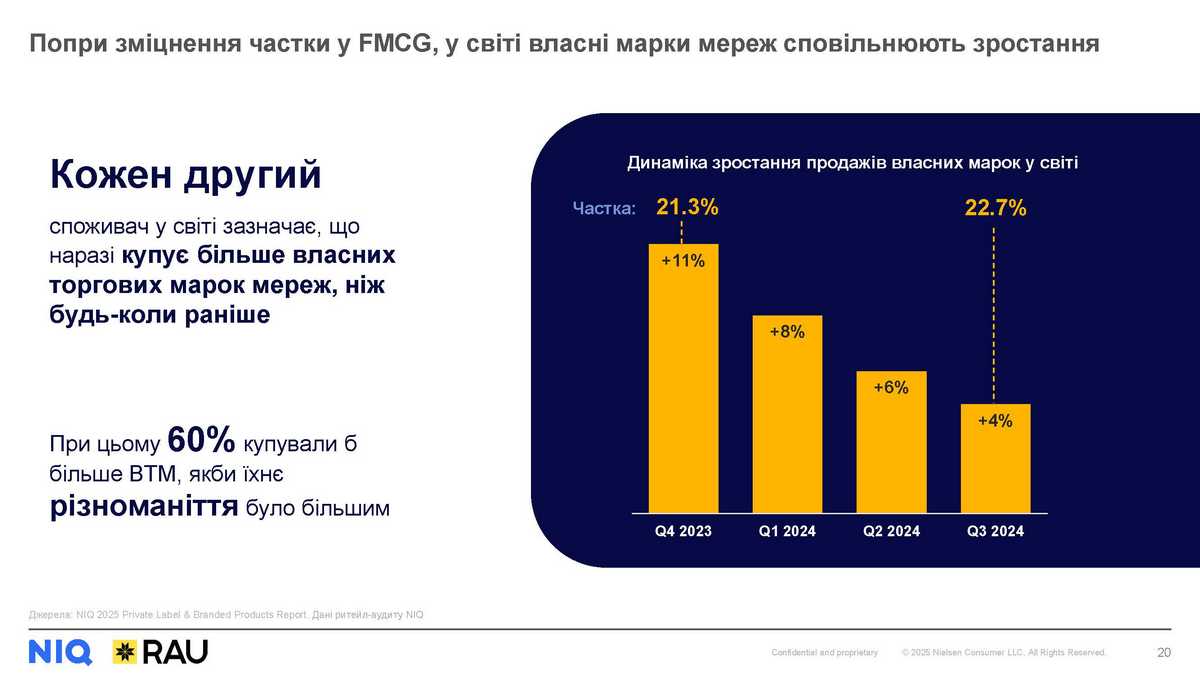 Частка власних марок мереж у світовому FMCG збільшується, однак темпи зростання продажів сповільнюються. Хоч наразі кожен другий споживач у світі зазначає, що купує більше власних торгових марок мереж, ніж будь-коли раніше, при цьому 60% купували б більше ВТМ, якби їхнє різноманіття було більшим. Враховуючи посилення позицій найбільших не-ВТМ брендів, необхідно чітко, спираючись на дані, формувати асортимент з метою загального зростання категорій.