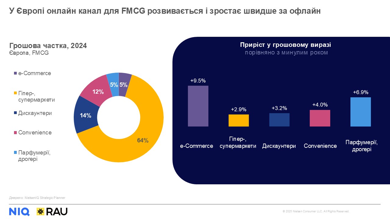 У товарообігу українського FMCG збільшується частка мінімаркетів площею до 150 кв. м, які зросли за рахунок розширення кількості магазинів на +19% у 2024-му порівняно з 2023-м. При цьому гіпермаркети площею понад 1500 кв. м показали найповільніше зростання серед форматів каналу гіпер-,супер-,мінімаркети за показниками товарообігу, кількості магазинів та середнього чеку. Найбільше зростання середнього чеку при цьому показують парфумерні магазини. Онлайн-торгівля – канал, який наразі демонструє найшвидше зростання як в Україні, так і у Європі. Якщо раніше ми бачили фокус зростання онлайн-продажів на певний перелік категорій, таких як міцний алкоголь, кава, дитяча гігієна та харчування та габаритні товари, то зараз найпопулярнішими місіями відвідування таких сайтів є велика основна закупка на тиждень-місяць та поповнення запасів. А це, у свою чергу, є прямою загрозою (або можливістю) перетікання попиту з фізичного ритейлу у електронну комерцію.