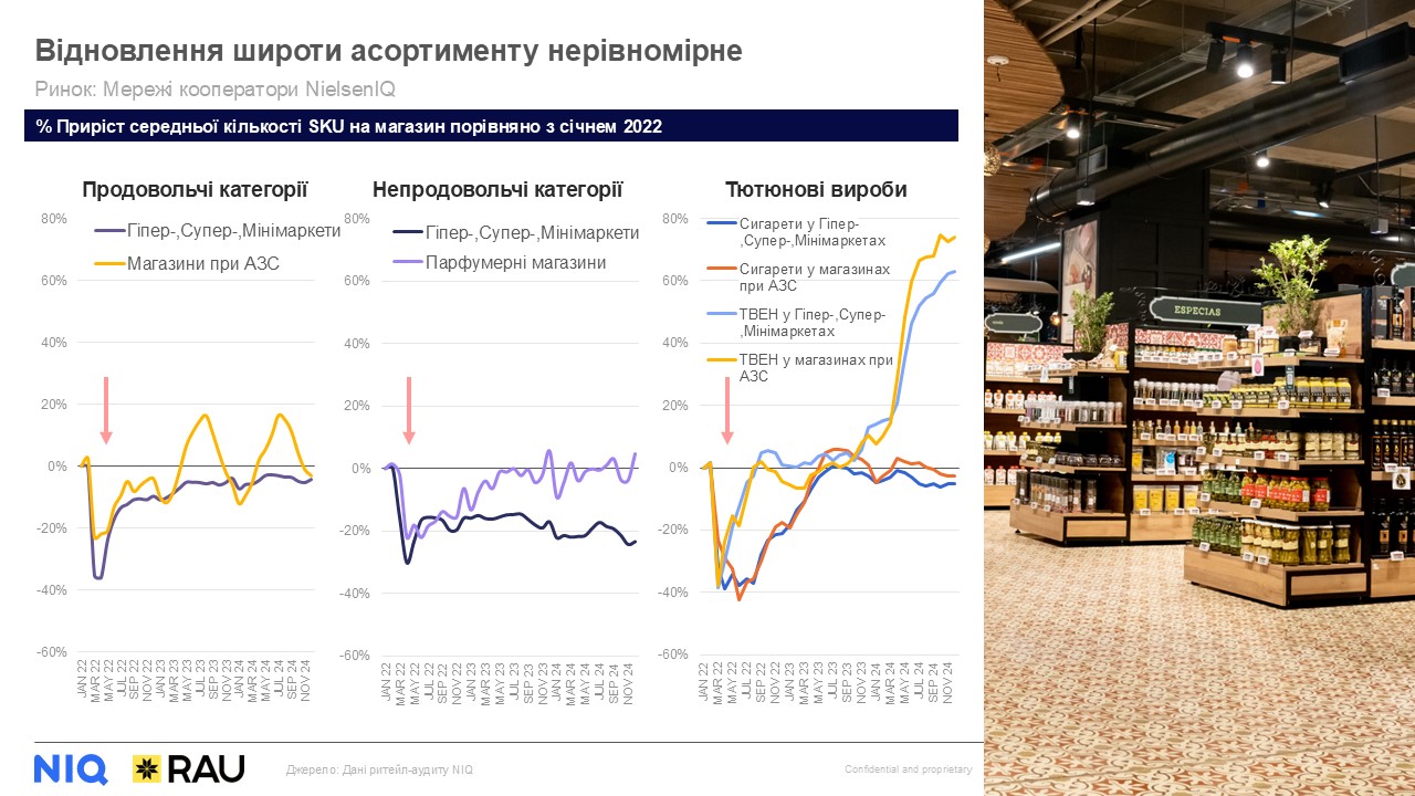 Після різкого звуження на початку повномасштабної війни ритейл поступово нарощує широту асортименту, але є деякі відмінності цього процесу у кошиках та каналах. Так, наприклад, вихід на рівень початку 2022-го відбувся у асортименті парфумерних магазинів, водночас непродовольчий асортимент grocery каналу досі приблизно на 20% менший за «довоєнний».