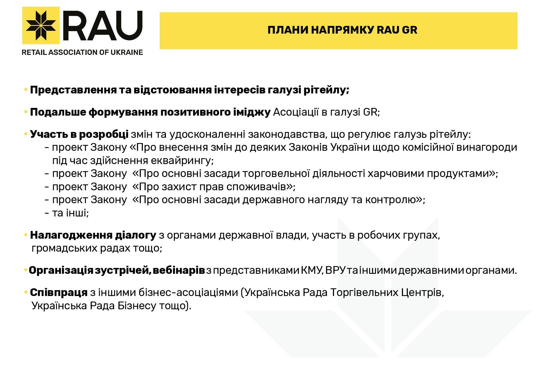 З метою ефективного прийняття рішень та узгодження позицій, на базі Асоціації було створено комітет з питань законодавчих ініціатив, до якого увійшли топ-менеджери провідних компаній, а також авторитетні експерти роздрібного ринку. Очолив комітет Андрій Жук, голова правління RAU, до складу комітету ввійшли: голова ради директорів, генеральний директор корпорації АТБ Борис Марков, голова ради директорів мережі магазинів Алло Дмитро Деревицький, генеральний директор компанії LC Waikiki Україна Олексій Гришко, генеральний директор ГК Union Group (мережа Золотий Вік та інші) Леонід Погребняк, генеральний директор Ашан Україна Вікторія Луценко, виконавчий директор компанії Фокстрот Олексій Зозуля, генеральний директор мережі магазинів Ельдорадо Віра Вітинська, член ради директорів BGV Group (мережа мінімаркетів КОЛО) Сергій Войцеховський, керуючий партнер юридичної компанії Ader Haber Юрій Петренко. Свою роботу комітет зосередить на розгляді важливих питань, які виникають на роздрібному ринку та потребують врегулювання.
