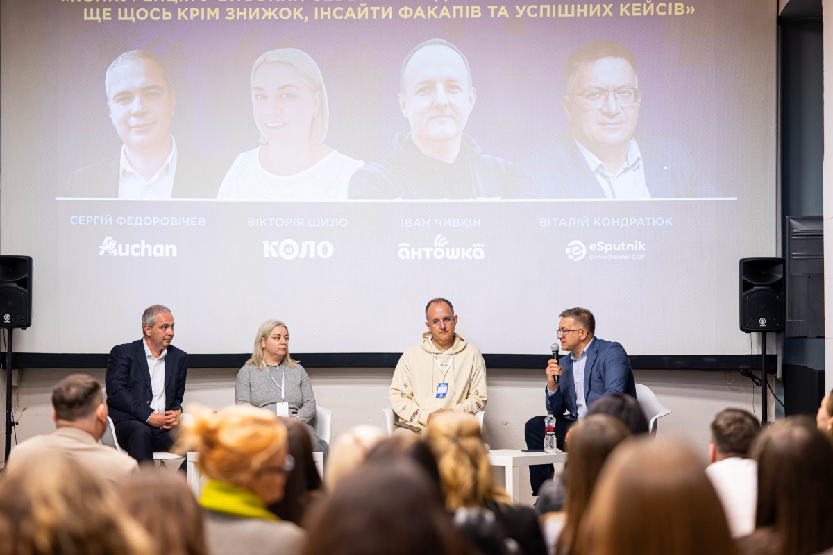 Завершальна частина заходу – панельна дискусія на тему: «Конкуренція у високий сезон: як виділитись у шумі, чи працює ще щось крім знижок, інсайти факапів та успішних кейсів», у якій взяли участь Сергій Федоровічев, операційний директор Auchan Україна, Вікторія Шило, комерційна директорка Коло, Іван Чивкін, виконавчий директор Антошка та модератор Віталій Кондратюк, Head of Retention Strategy Department в eSputnik.