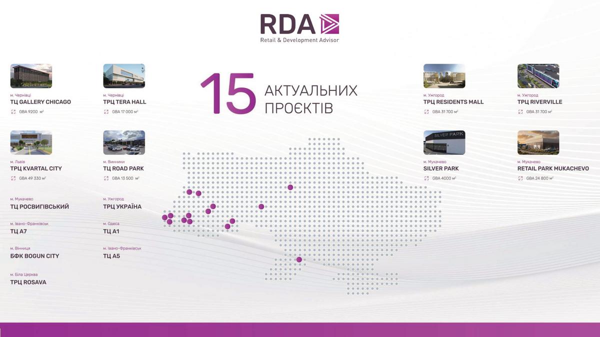 Консалтингова компанія Retail & Development Advisor (RDA) наразі має в роботі 15 проєктів на різних стадіях реалізації та ще 4 проєкти на стадії підготовки до їх представлення громадськості.