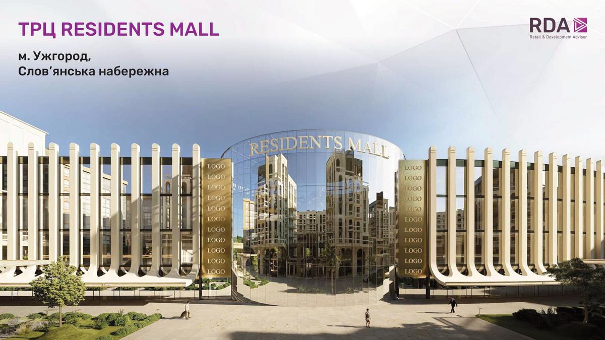 ТРЦ Residents Mall, м. Ужгород, вул. Слов’янська набережна. Ще один торгівельний центр в Ужгороді загальною площею майже 15 700 кв. м планується збудувати в найдорожчому ЖК міста біля Боздоського парку. Відповідно тут розмістяться ритейлери класу середній плюс та преміум. Це теж зона новобудов з великою часткою молоді серед мешканців. В новому об’єкті вже підтверджено розміщення двоповерхового магазину Symbol на 2000 кв. м. З п’яти рівнів ТРЦ два займатиме підземний паркінг площею майже 16 000 кв. м.