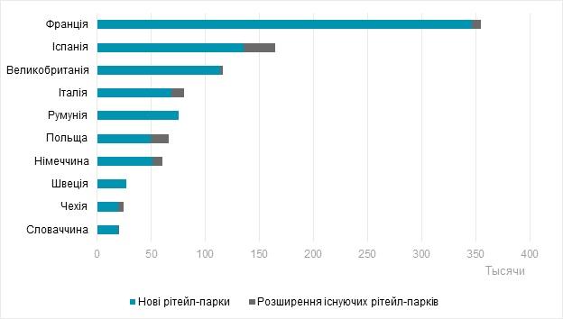 У Франції девелопмент рітейл-парків сповільнюється (-22% в порівнянні з 2017 р.), проте обсяг річної нової пропозиції в сегменті перевищив обсяг нової пропозиції торговельних центрів. На етапі девелопменту знаходиться 782 тис. кв. м нових рітейл-парків, що становить 54% від загального обсягу будівництва в Європі. Покращений дизайн рітейл-парків нового покоління сприяє привабливості цих об’єктів як для орендарів, так і для відвідувачів.
