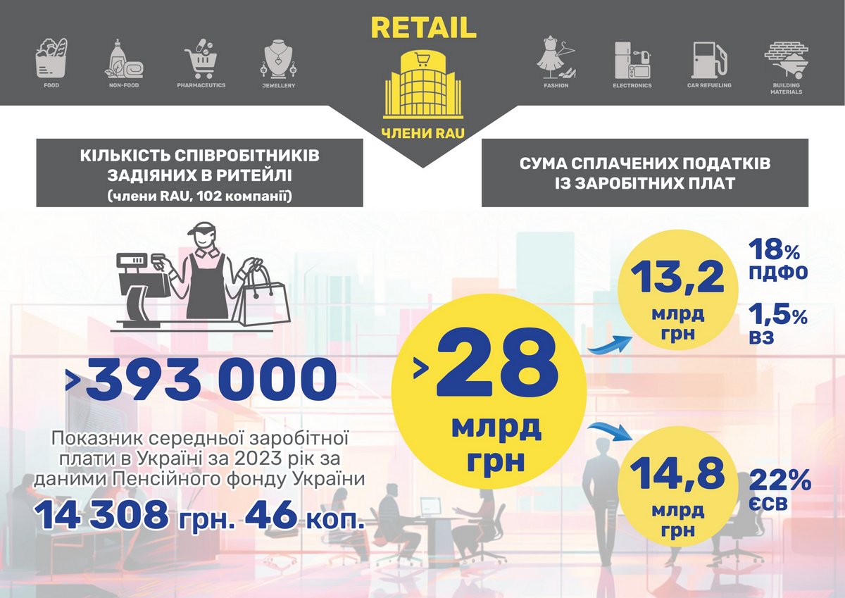 За 12 місяців минулого року провідні компанії галузі ритейлу заплатили більше 28 млрд грн податків на працю у вигляді ПДФО, військового збору та ЄСВ і забезпечили роботою більше 393 000 працівників.