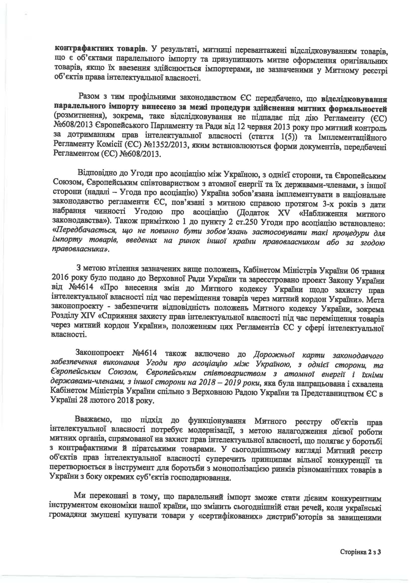 Мета вищезазначеного документу – адаптація митного законодавства України до відповідних Регламентів ЄС у сфері інтелектуальної власності, зокрема, усунення адміністративних бар’єрів у торгівлі брендованими товарами та спрощення паралельного імпорту в Україну. Він був поданий Кабінетом Міністрів України до Верховної Ради ще в травні 2016 року.