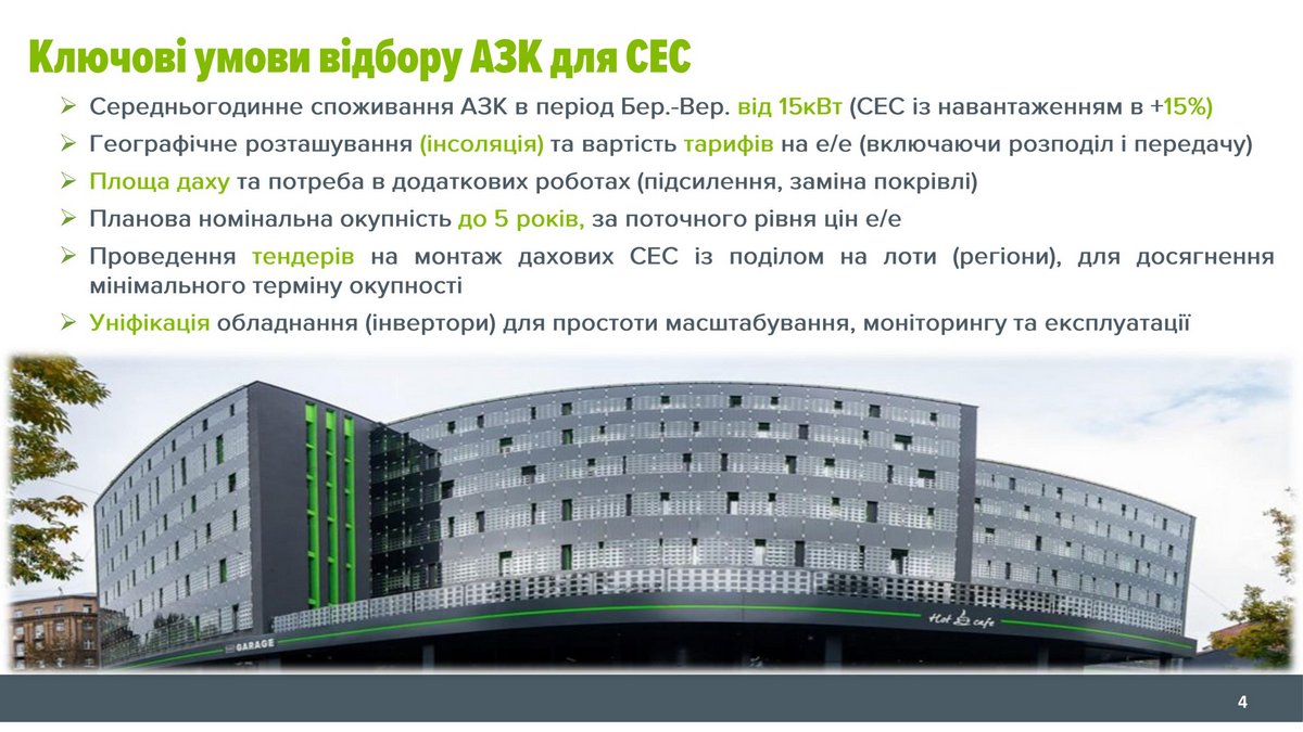 Одним із найголовніших показників при розрахунках є середньогодинне споживання об’єкту в період з березня по вересень, коли сонячна генерація працює в найбільш типовому режимі. На АЗК цей показник складає 15 кВт до якого додається «запас» в 15-20% генерації СЕС, аби вона лишалася економічно вигідною.