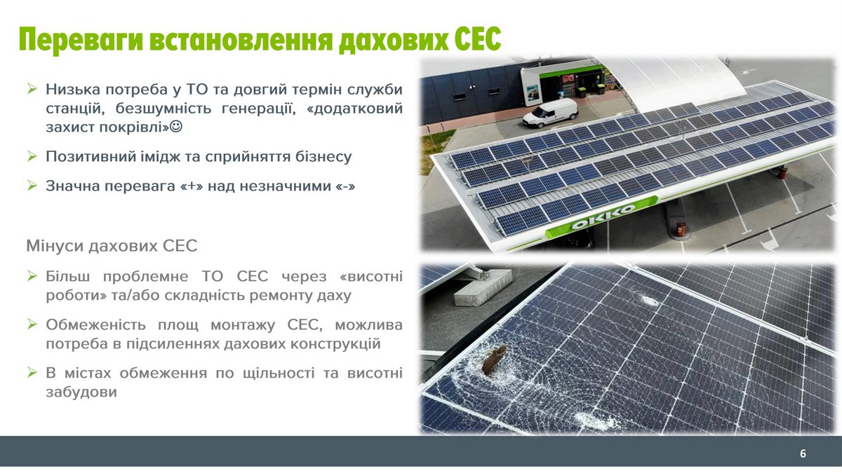 Виходячи із досвіду мережі ОККО, практично кожен ритейлер може встановити у себе на дахах чи де інде сонячні панелі заради часткового чи повного задоволення власних потреб. Це допоможе як підвищити стійкість об’єктів під час блекаутів, так і зекономити на оплаті споживання із загальної мережі. Але щоб отримати вагомий економічний ефект, треба дуже ретельно все розрахувати. Наприклад, перша спроба встановлення сонячних панелей на АЗК з використанням «зеленого тарифу» виявилася невдалою. Пілотний проєкт із семи дахових СЕС сумарною потужністю 123 КВт так і не змогли запустити протягом двох років через певні технічні обмеження та бюрократичні процедури.