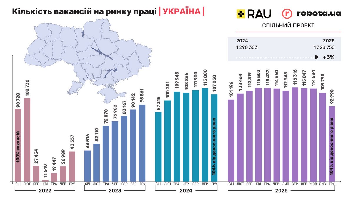 Експерти відмічають, що ринок праці в Україні досяг своєрідного плато і, як прогнозувалося раніше, найближчими роками темпи зростання сповільняться. Так, у 2025-му, в порівнянні з попереднім роком кількість вакансій зросла на 3%. При стабілізації кількості вакантних робочих місць на відмітці близько 115 000, в грудні 2025 року зафіксовано значне падіння цього показника. Аналітики пов'язують це з сезонністю та економічною нестабільністю, спричиненою загальною ситуацією в країні. І найбільше падіння кількості вакансій було зафіксовано саме у сферах HoReCa та FMCG.
