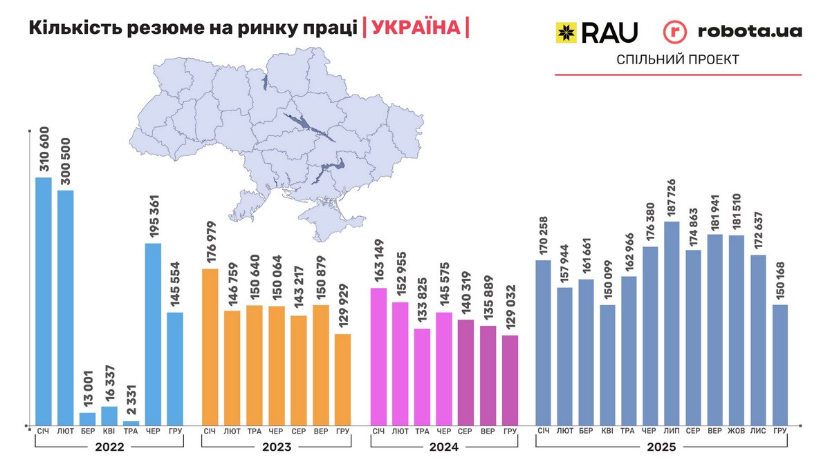 Розглядаючи динаміку кількості резюме, можна чітко побачити, що в 2025 році шукачі роботи були найактивнішими в порівнянні з попередніми двома роками. Але до відновлення довоєнного рівня ще дуже далеко. Щоб побачити це, достатньо порівняти минулорічні показники з даними за січень та лютий 2022-го, тобто до повномасштабного вторгнення. Вони відрізняються приблизно удвічі.