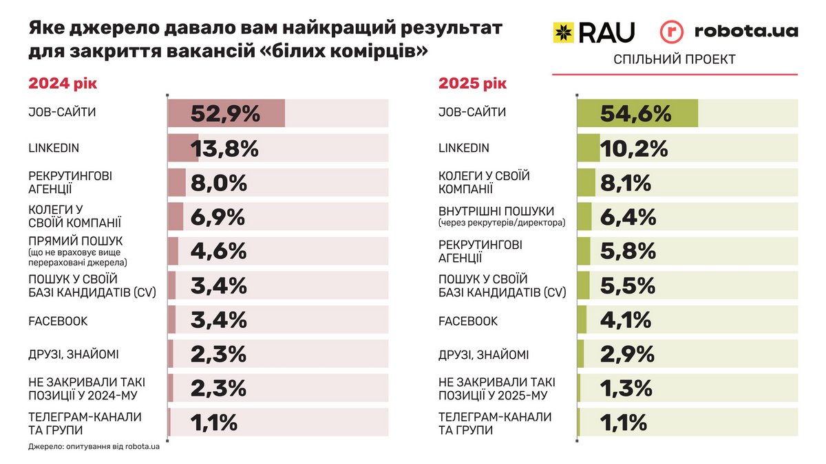 Як показали результати опитування 639 компаній-роботодавців з різних галузей, найчастіше їм вдавалося закривати вакансії білих та синіх комірців через сайти пошуку роботи (майже 55% та 61% відповідно). Проте інші канали залучення кадрів суттєво відрізняються в залежності від категорії фахівця. Так, для пошуку офісного персоналу та керівників на другому місці за ефективністю є LinkedIn, який у Європі стає реальним конкурентом job-сайтам та рекрутинговим агенціям. А от для продавців та офіціантів залучення через LinkedIn та агенції не перевищує 1-3%. Для пошуку фахівців тут краще спрацьовують реферальні програми – поради колег у власній компанії (11%), так само як і для найму білих комірців (більше 8%). Також у 2025 році у пошуку синіх комірців збільшилася роль телеграм-каналів (8%) та груп у соціальних мережах.