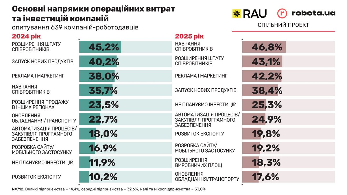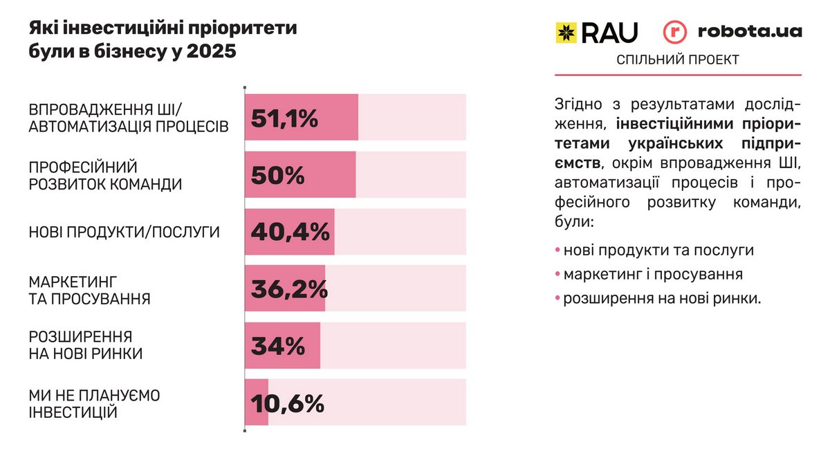 Певні зміни сталися й у пріоритетних напрямках інвестуванням коштів. Якщо в 2024 році більше 40% українського бізнесу було налаштовано на розширення штату і запуск нових продуктів, то в 2025-му навчання співробітників вийшло на перше місце, потіснивши навіть розширення штату: майже 47% і більше 43% відповідно. У цьому множинному виборі відповідей чітко видно, що компанії надають перевагу і вибирають зараз навчання співробітників як один з пріоритетів. Серед основних напрямків інвестування також були реклама та маркетинг, а також автоматизація бізнес-процесів.