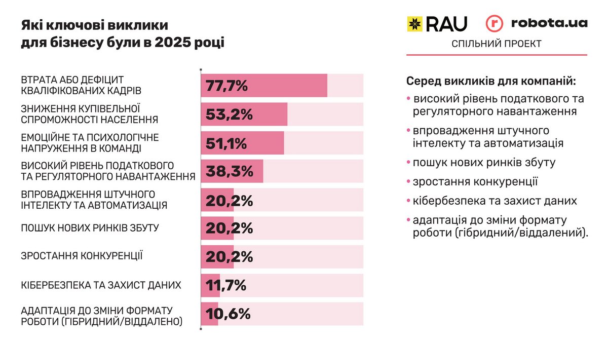 Щодо викликів, з якими бізнес стикнувся у своїй роботі в минулому році, найбільшим ризиком був дефіцит та втрата кваліфікованих кадрів (78% опитаних). На другому місці за значимістю відзначається зниження купівельної спроможності населення, що позначилося на продажах. Тому не дивно, що емоційне та психологічне напруження в командах також відчувається. Про це сказали більше половини опитаних. І на додачу високий рівень податкового та регулярного навантаження на компанію. Це ті проблеми, які найбільше хвилюють бізнес у всіх галузях економіки.
