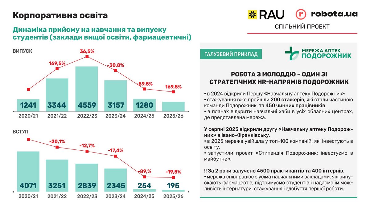 Окремої уваги заслуговує аптечна галузь, де сталися суттєві зміни, в тому числі через державне регулювання галузі. Якщо компанії-члени RAU за минулий рік відкрили 764 аптеки і закрили 367, з чистим приростом 397 аптек, то по ринку в цілому картина інша. За даними компанії Proxima Research, яка аналізує ринок фарми в цілому, на початок минулого року в Україні налічувалося 18 385 аптек. За 2025 рік було відкрито 1572 аптеки, але водночас було закрито 1780. В результаті лишилося працювати 18 177 аптек, тобто спостерігається від'ємна динаміка. Відповідно, кількість вакансій у даному сегменті ритейлу скоротилася в 2025 році на 14%. Серед найбільш популярних посад значна частка припадає на провізорів-фармацевтів (41%), які разом із медичними представниками складають половину ринку.