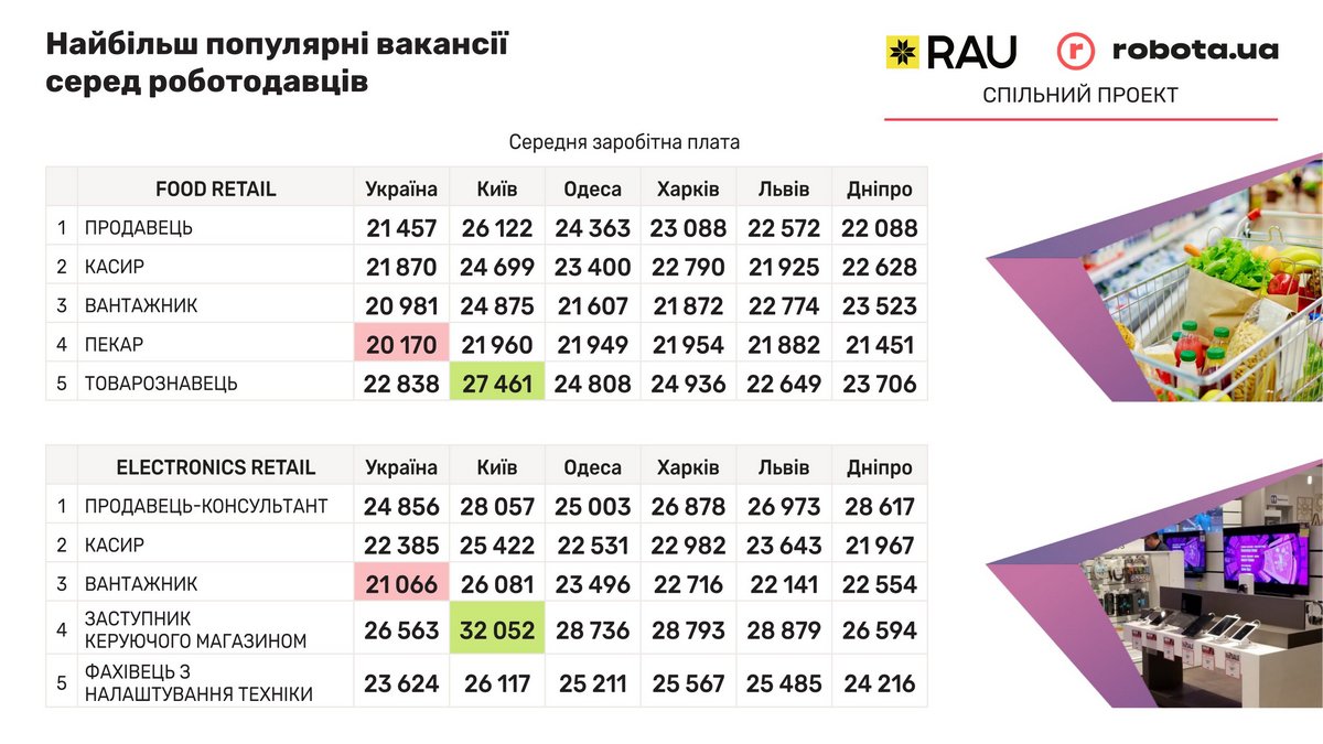 Серед найбільш популярних вакансій, які пропонують роботодавці у сфері фуд ритейлу, найдорожче оцінюють працю товарознавця в Києві, де готові платити 27 461 грн. При середній ставці по Україні 20 838 грн. Робота пекаря в Україні оплачується на рівні 20 170 грн, хоча в столиці можна заробити майже 22 000 грн.