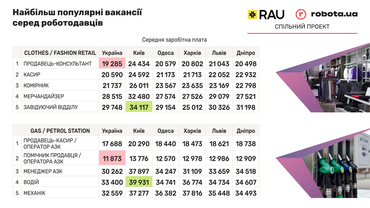 В паливному ритейлі найменші ставки зафіксовало у помічника продавця/оператора АЗК, яким в середньому пропонували 11 873 грн. Що майже на 6000 грн менше за середню ставку власне продавця/оператора АЗК. Цікаво, що більше роботодавці готові були платити механікам у Харкові (37 816 грн), а не в столиці. Вірогідно, більша оплата у прифронтовому Харкові є певною компенсацією за більший ризик. Але найдорожче оплачувалася паливними операторами професія водія у Києві – 39 931 грн при середньому показнику по країні в 33 400 грн.