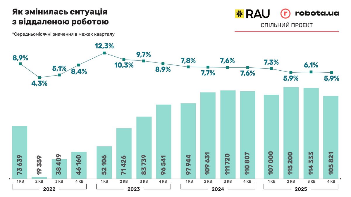 Якщо розглянути динаміку процесу частки вакансій з віддаленою роботою, можна помітити сплеск їх кількості в кінці 2022-го та на початку 2023 року, коли внаслідок атак на енергетичну інфраструктуру України багато людей були змушені працювати вдома, в кафе чи коворкінгах. З часом кількість таких вакансій поступово зменшувалася до частки в 7,6%. Наразі спостерігається подальше зменшення до рівня 5-6%.