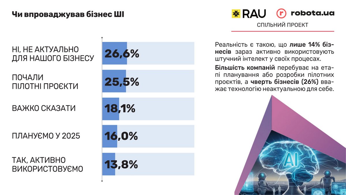 Окремо провели дослідження стосовно впровадження компаніями штучного інтелекту. Зокрема, виявилося, що майже 27% компаній назвали це не актуальним для свого бізнесу, а почали впроваджувати ШІ 25,5%. Водночас активно користуються цим інструментом майже 14%.