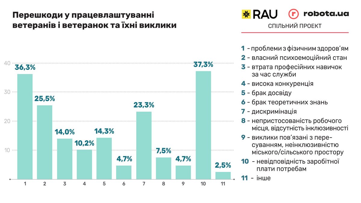 Також ветерани назвали три основні причини звільнення з першого цивільного місця роботи після військової служби. Вони корелюють з перешкодами, з якими зтикаються ветерани. Зокрема, це заробітна плата, проблеми з фізичним здоров'ям, психоемоційний стан, відсутність відчуття приналежності до колективу, відсутність відчуття важливості виконаної роботи. Хоча більше 40% не змінювали першого місця роботи.