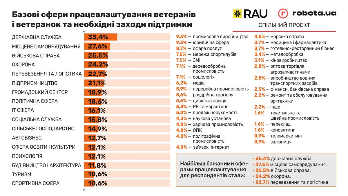 Серед найбільш пріоритетних сфер працевлаштування ветерани називають державну службу (35,4%), органи місцевого самоврядування (27,6%), військова справа (25,5%). А також це охорона та перевезення і логістика.