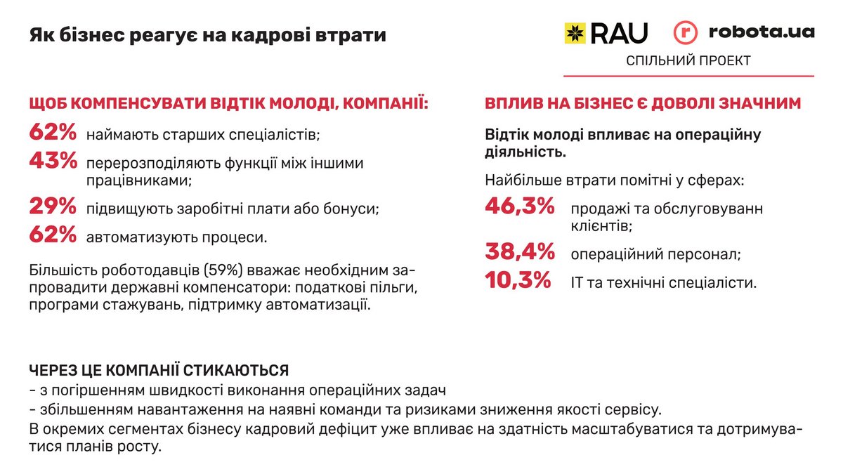 Бізнеси реагують на кадрові втрати, наймаючи спеціалістів старшого віку (62%), які, як уже згадувалося, є активними кандидатами на ринку праці. А також перерозподіляють функції між працівниками всередині, підвищують заробітні плати або впроваджують бонусну систему і автоматизують процеси.