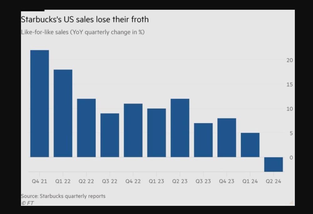 У квітні 2024 року компанія повідомила про невтішні квартальні результати: продажі в США впали на 3% попри підвищення цін, а трафік – на 7%. Мережа кав’ярень також вже вдруге скоротила свій прогноз на 2024 рік. В результаті компанія втратила п’яту частину своєї біржової вартості. Ринки тоді спекулювали щодо можливого успішного повернення генерального директора Говарда Шульца, незважаючи на його заяви про відсутність планів повертатися на «четверту каденцію». Детальніше з історією Starbucks та її керівництва можна ознайомитися тут.