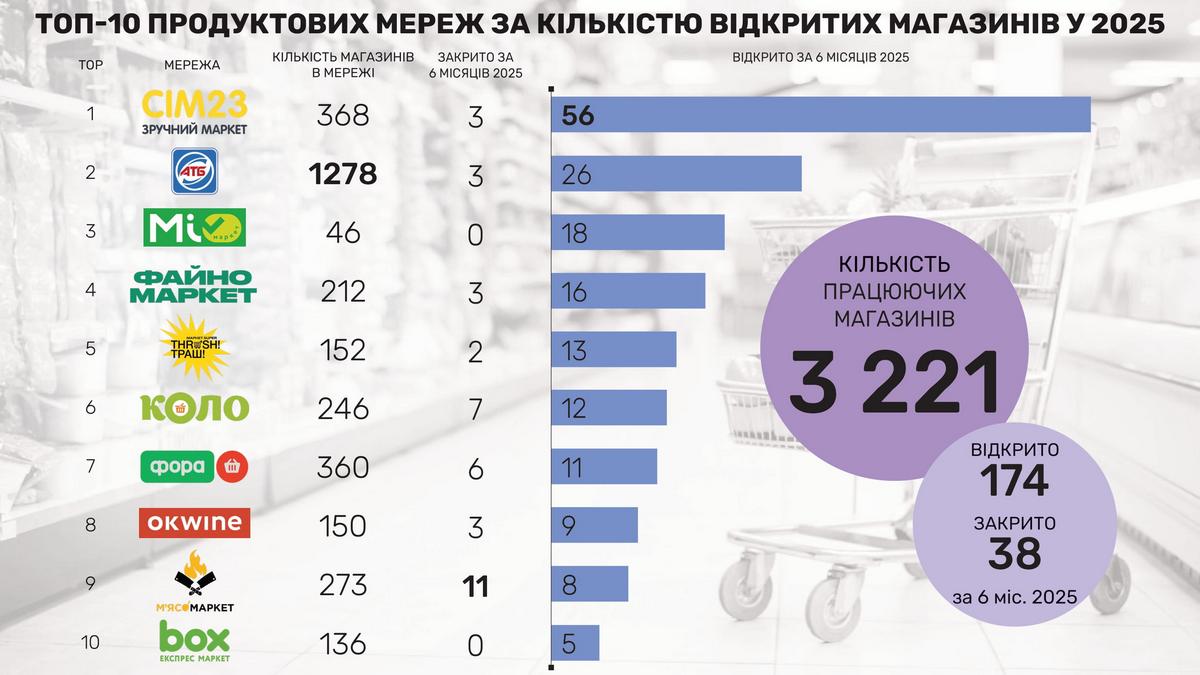 Топ-10 українських продуктових мереж за кількістю магазинів і темпами відкриттів у I півріччі 2025 року