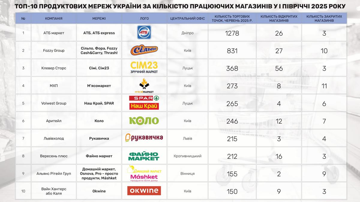 Перша десятка FMCG-операторів України за загальною кількістю магазинів виглядає наступним чином: найбільшою мережею сегменту продовольчого роздробу лишається АТБ, яка станом на кінець червня 2025 року вже мала 1278 магазинів. За січень-червень ритейлер додав 26 нових точок, закривши тільки три.