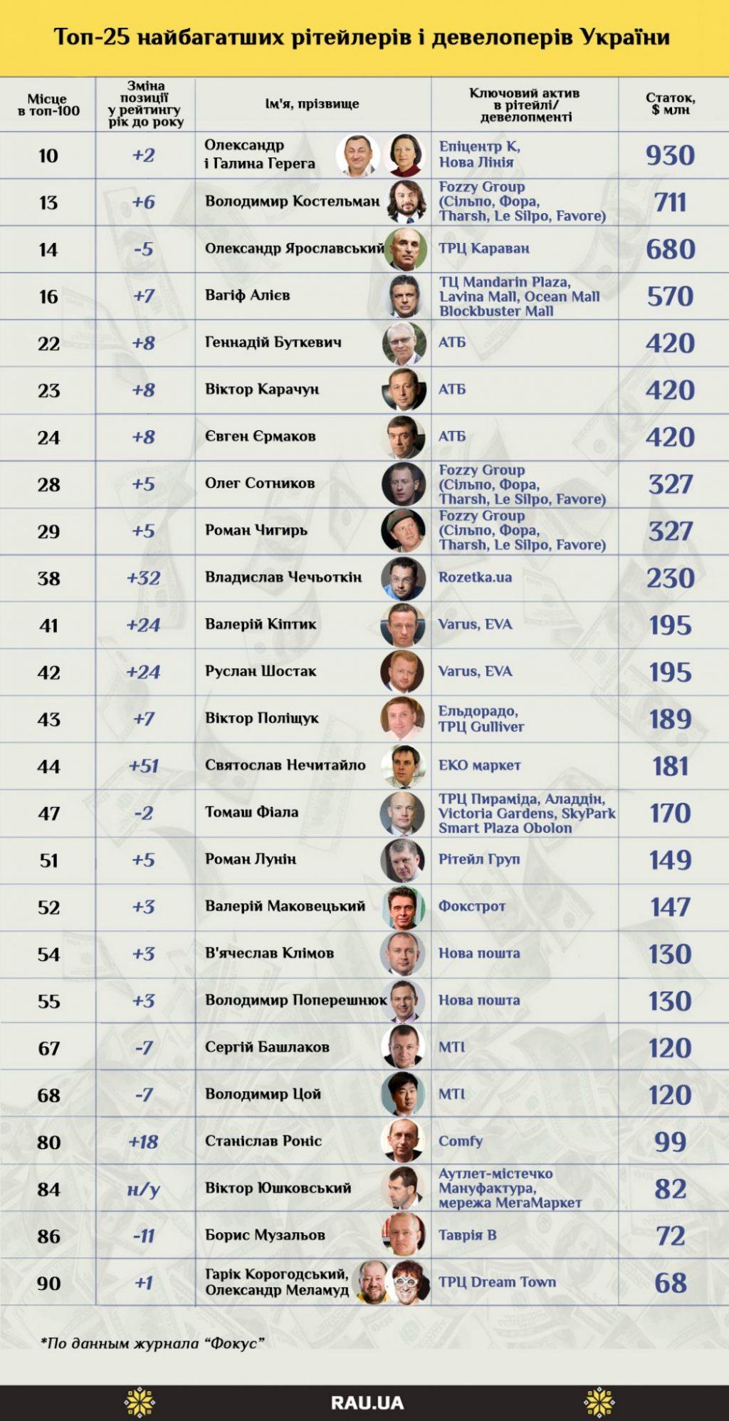 Аналіз складеного Фокусом списку ста найбагатших українців, проведений RAU, показує, що як мінімум чверть з мультимільйонерів так чи інакше пов’язані з рітейлом або девелопментом торговельної нерухомості. Причому практично всі рітейлери за минулий рік тільки зміцнили свої позиції, а деякі – потрапили в рейтинг вперше або після довгої відсутності (позначені в графі «Зміна за рік» відміткою «н/у»).