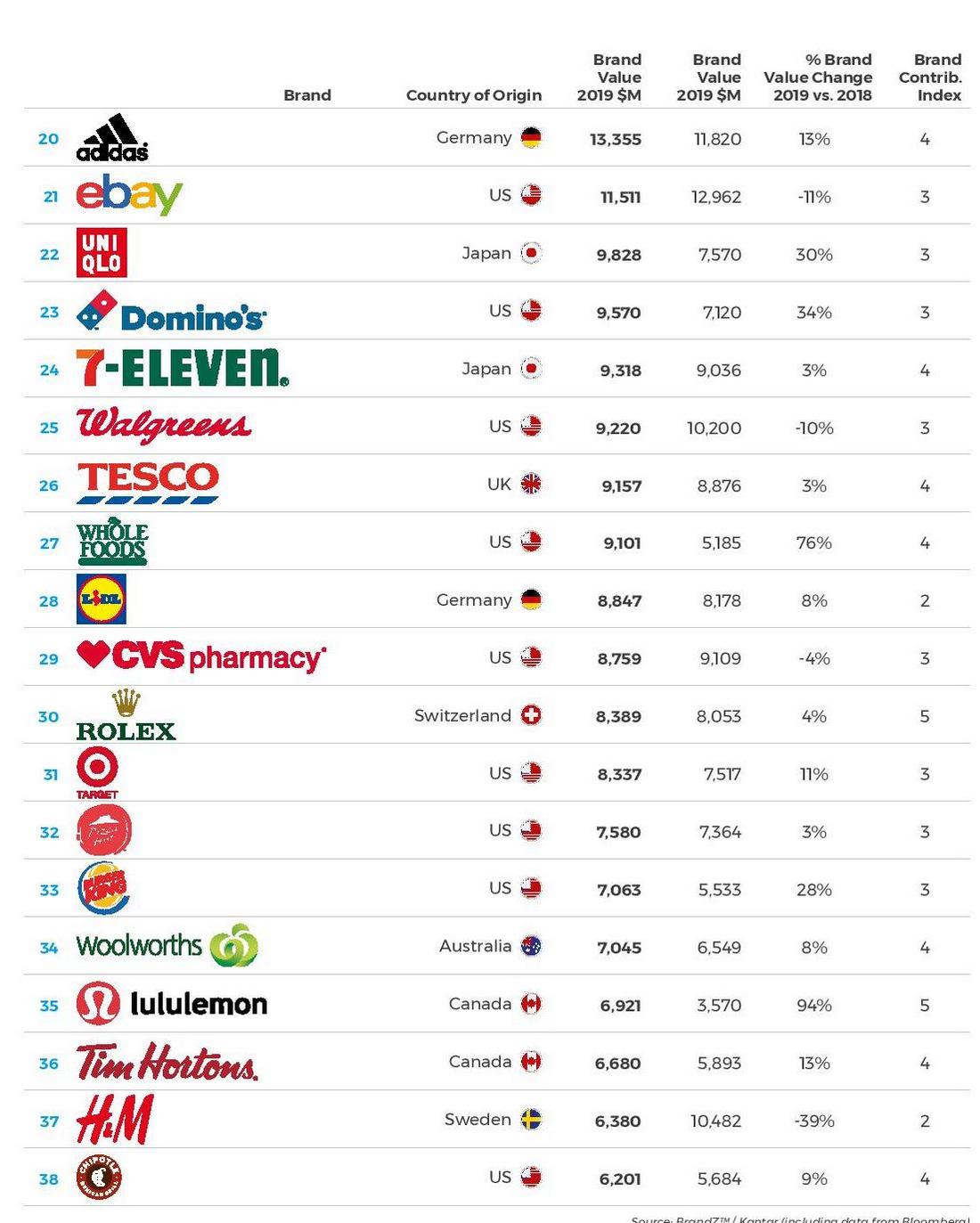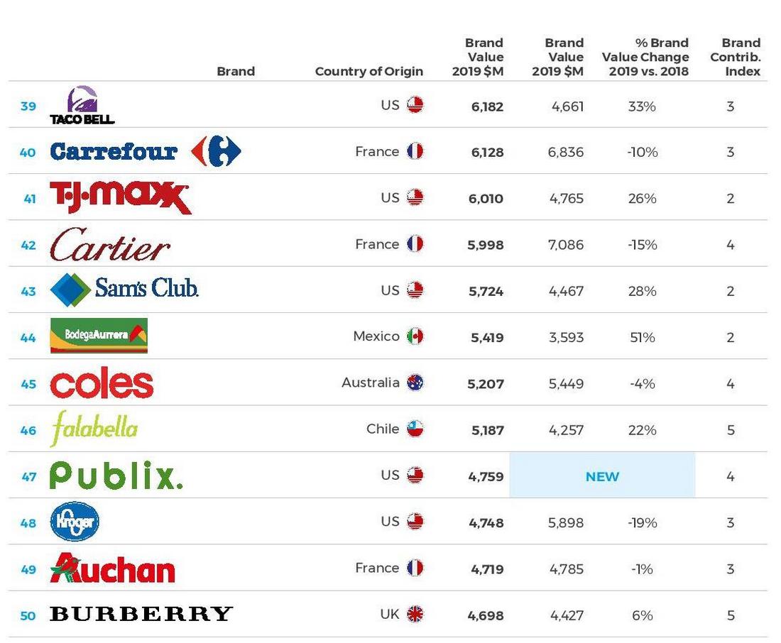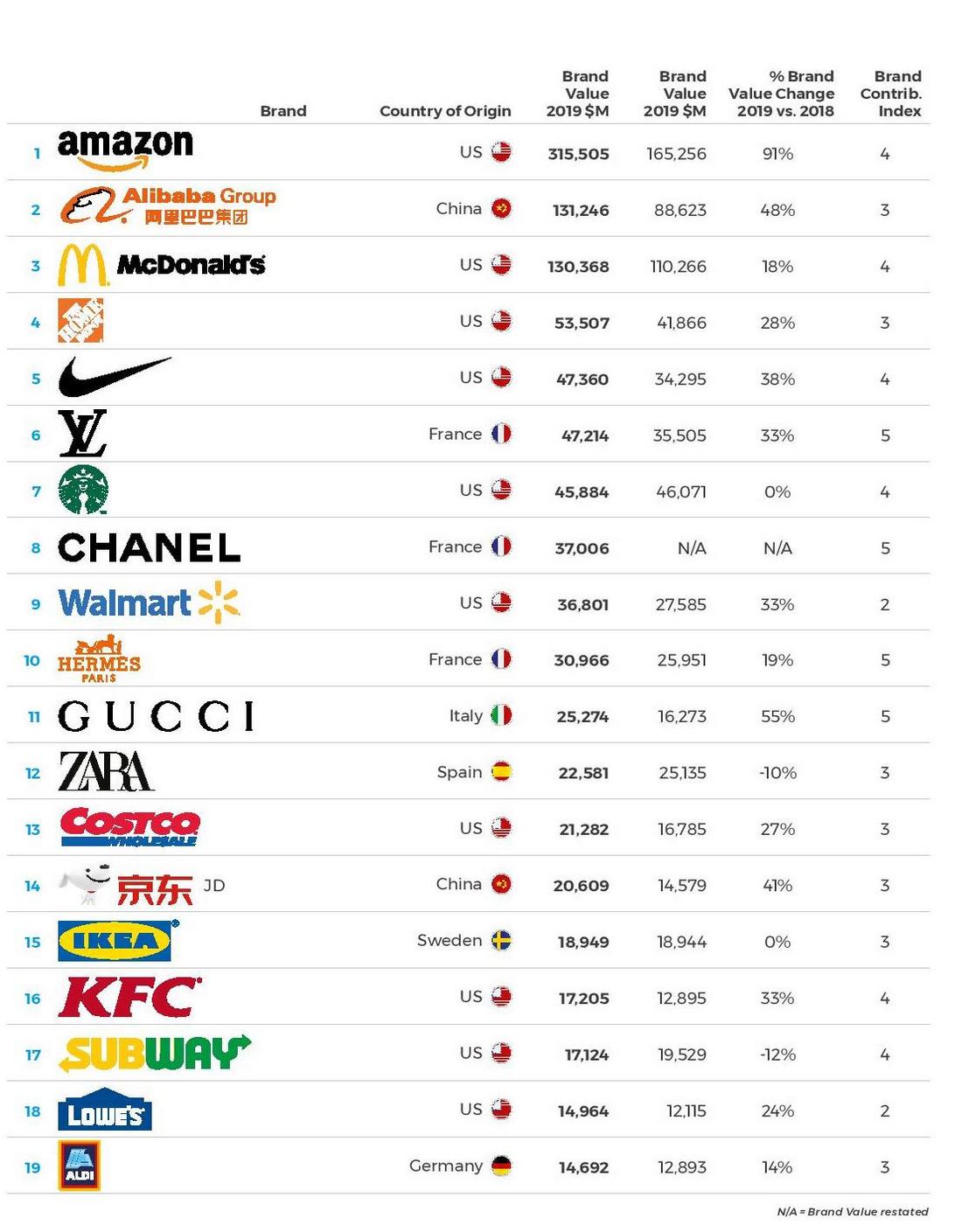 Amazon, IKEA (номер 15) і Aldi (номер 19) продовжують збільшувати цінність своїх брендів в 2019 році, пропонуючи товари за низькими цінами, створюючи сильний бренд і пропонуючи відмінний купівельний досвід.