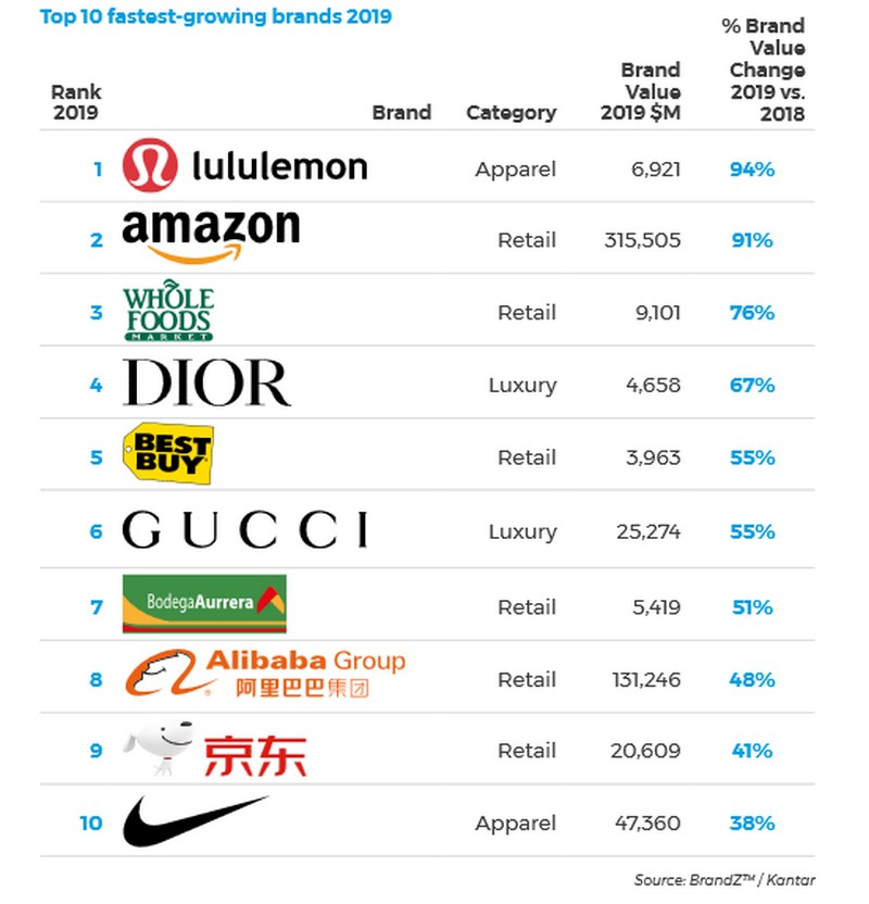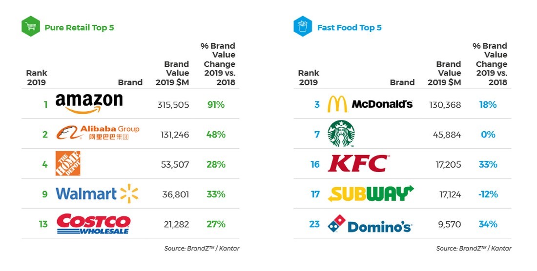 Загальна вартість 75-ти найдорожчих ритейл-брендів світу оцінюється зараз в $1,4 трлн, що на $339 млрд більше, ніж в минулому році. Чверть цієї суми (23%) припадає на Amazon, який практично подвоїв вартість бренду за рік. Динаміка Alibaba, який займає друге місце, помітно нижче – в порівнянні з 2018-м ціна бренду китайського конгломерату зросла на 48%.