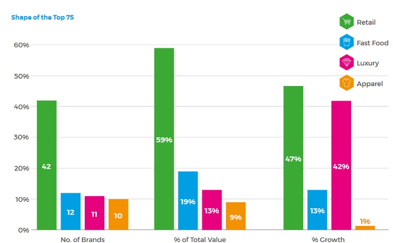 Саме класичні рітейлери і маркетплейси складають 42% компаній зі списку. Вони ж забезпечили максимальне зростання вартості в 47% за рік. За швидкістю набору цінності з ними можуть змагатися хіба що представники сектора товарів класу люкс. Фаст-фуд відстає від лідерів приблизно втричі за темпами зростання.