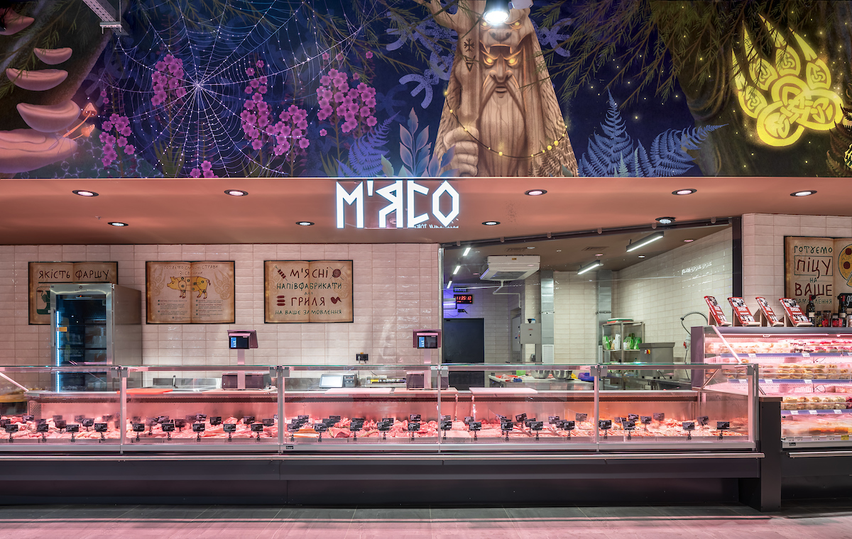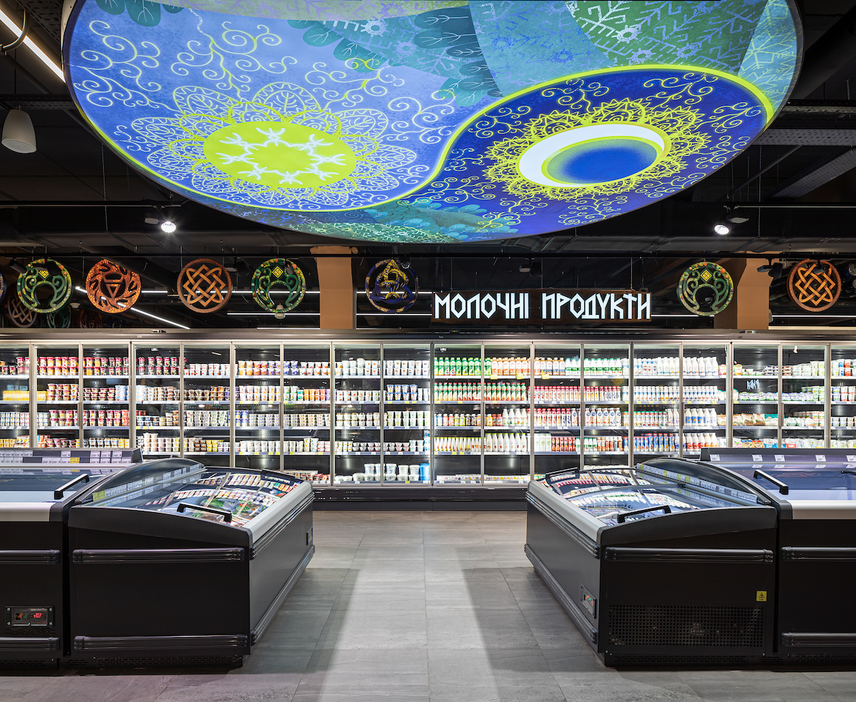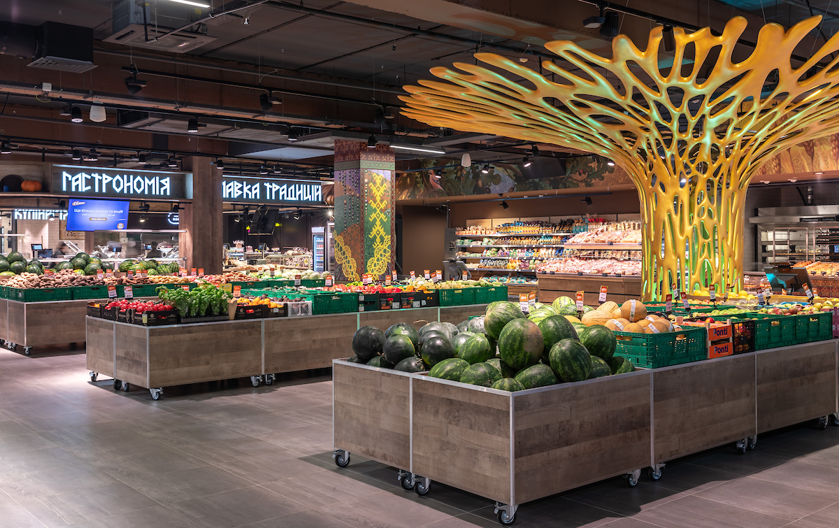 В оформленні нового магазину поєдналися стихії, краса природи, старовинні язичницькі символи – все це “під опікою” давньослов’янського бога Велеса. Саме статуя бога Велеса зустрічає гостей на вході до магазину. Посеред овочевого відділу розміщена інсталяція дерева життя, яке символізує єдність трьох світів – небесного, земного та потойбічного, а касові лайтбокси виконані у формі тотемів Велеса. У дизайні торговельного залу багато старовинних язичницьких символів та елементів побуту. Переглянути більше фото нового супермаркету – можна в окремому фотоогляді RAU.