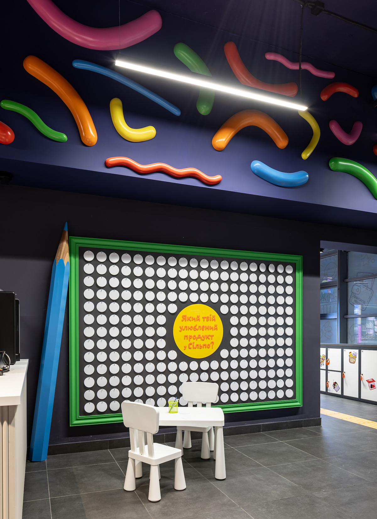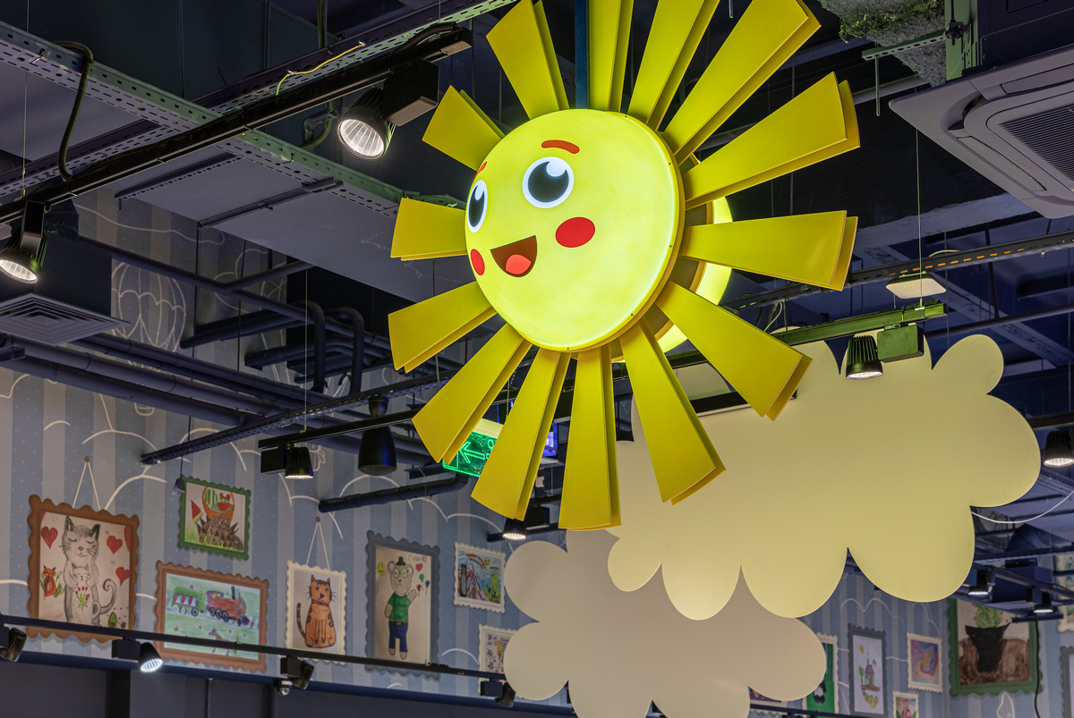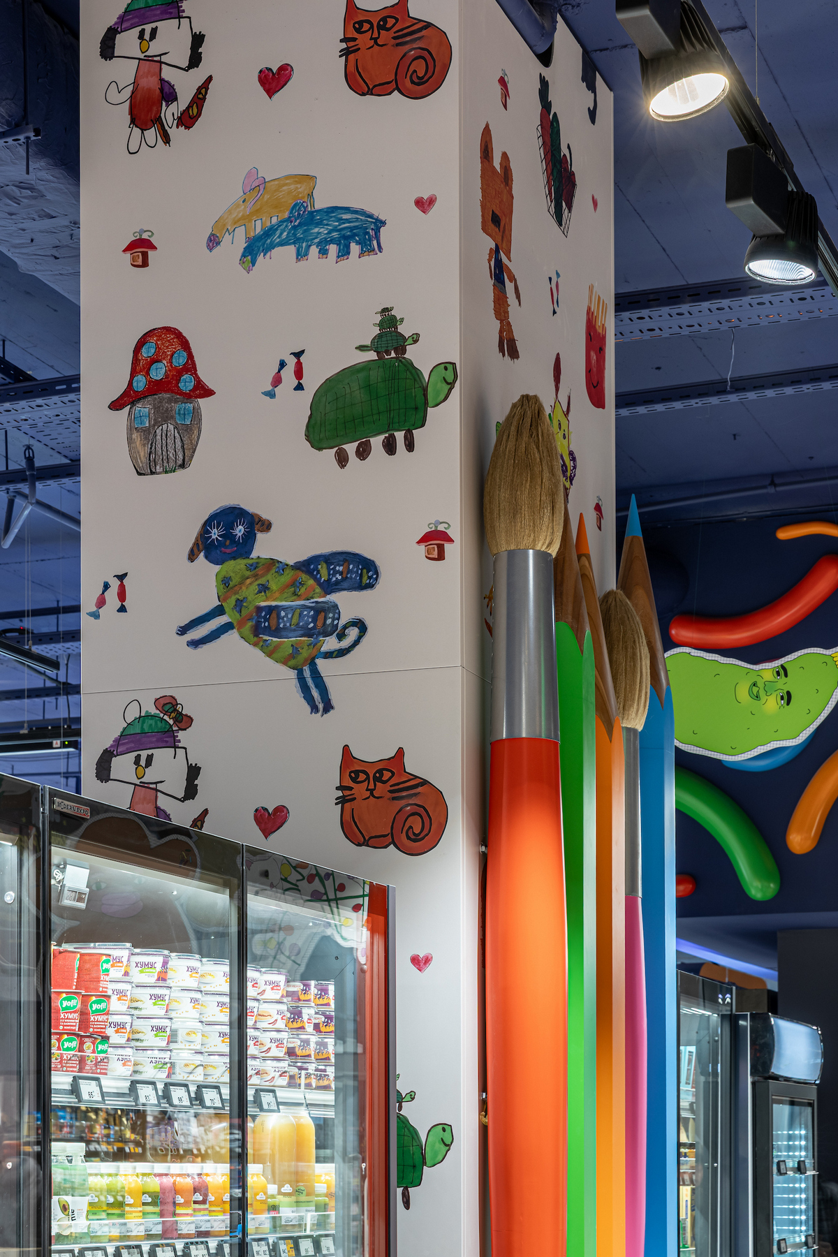 Під стелею «пливуть» намальовані хмаринки, дощ із прозорих крапель нагадує акварель, а таблички в залі мають такий вигляд, ніби їх щойно намалювали фломастерами. На вході — велика мистецька дошка, де кожна дитина може залишити свій малюнок і стати частиною дизайну супермаркету.