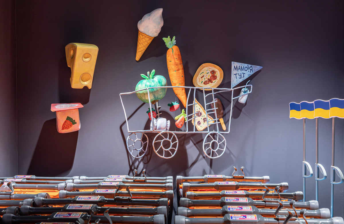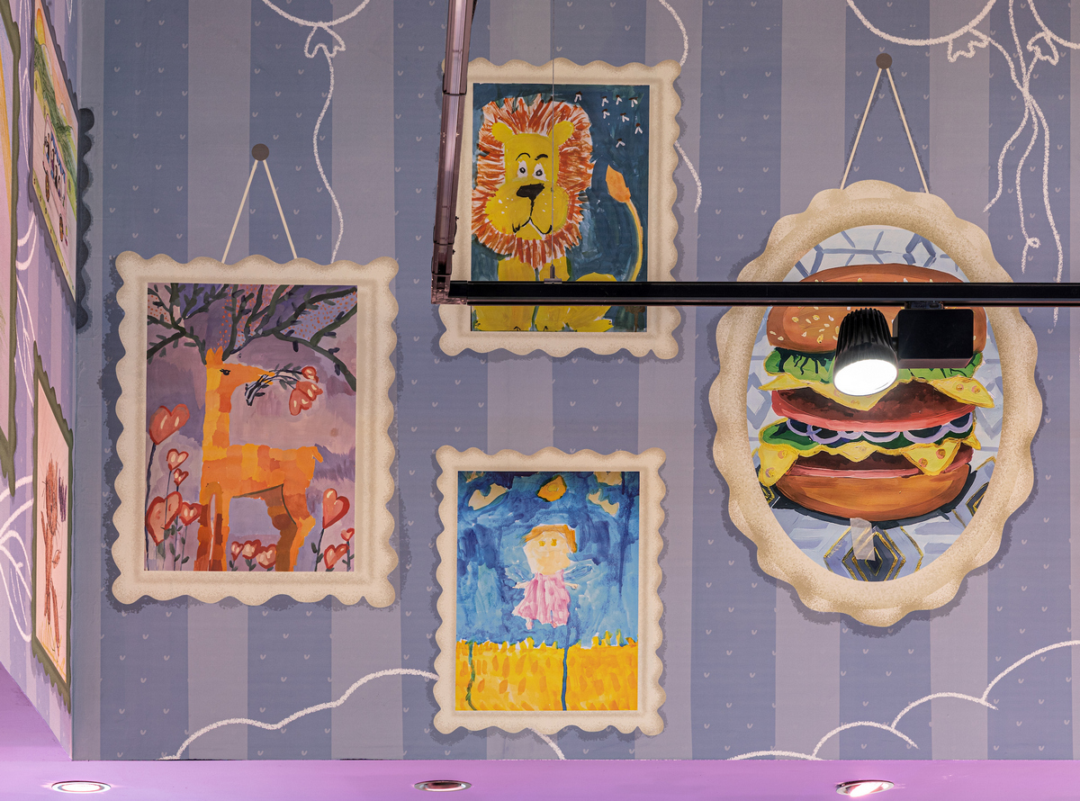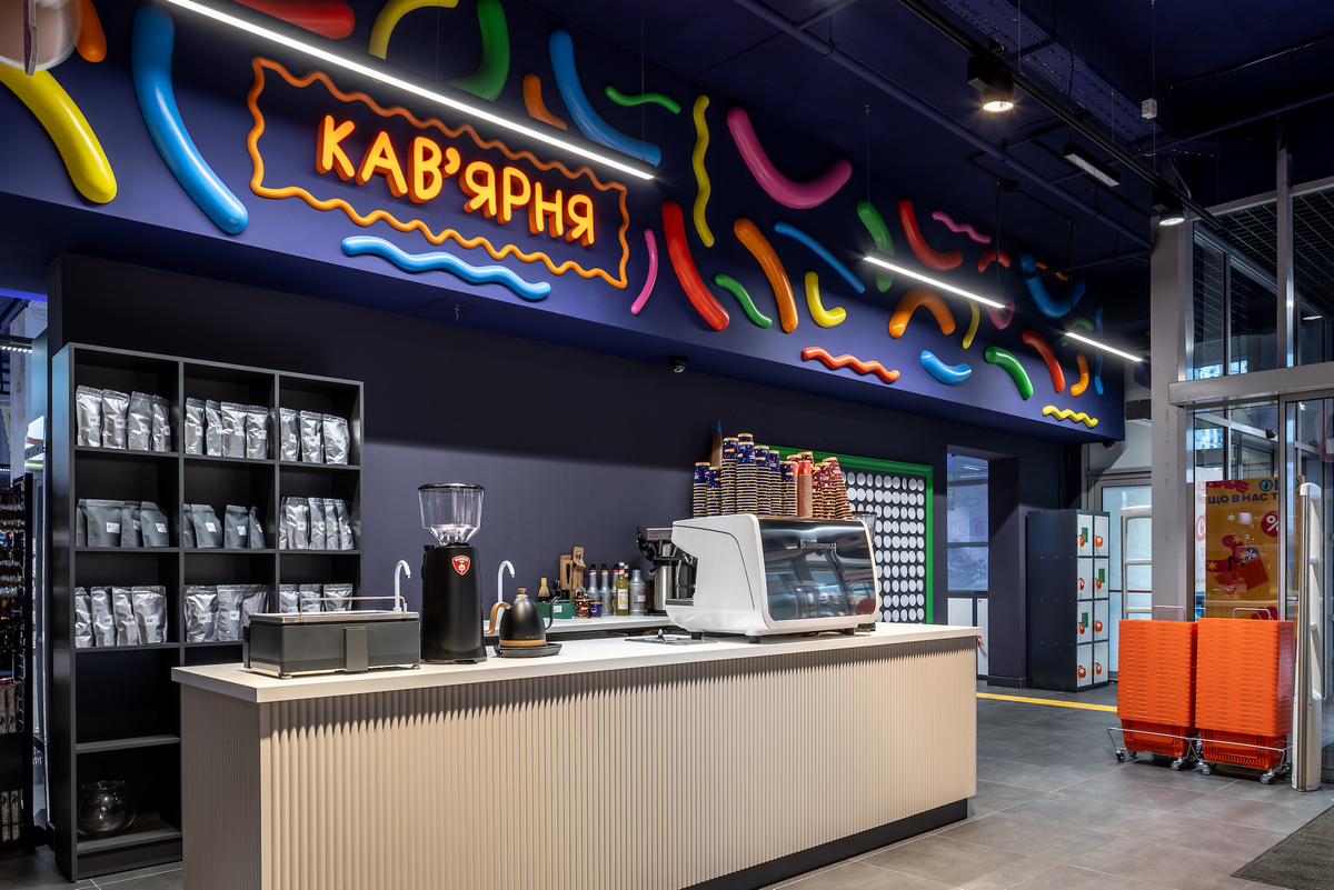 Під стелею «пливуть» намальовані хмаринки, дощ із прозорих крапель нагадує акварель, а таблички в залі мають такий вигляд, ніби їх щойно намалювали фломастерами. На вході — велика мистецька дошка, де кожна дитина може залишити свій малюнок і стати частиною дизайну супермаркету.
