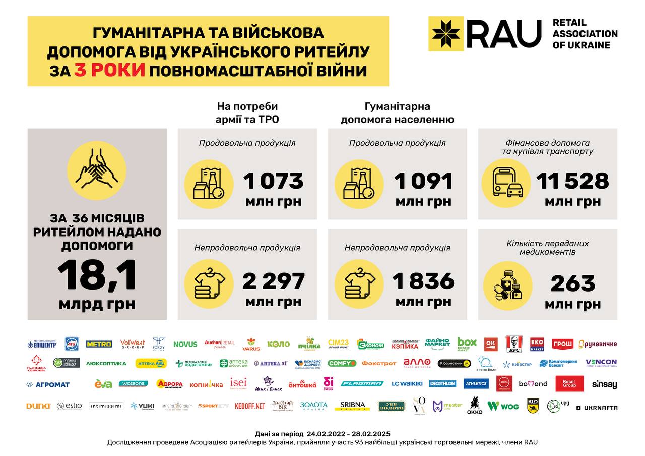 Загалом за три роки війни українські ритейлери зібрали та передали допомоги на суму 18,1 млрд грн. Зокрема, на потреби армії та територіальної оборони було передано продовольчої продукції на суму 1,073 млрд грн та непродовольчої продукції на суму понад 2,3 млрд грн. Населенню було надано продовольчої гуманітарної допомоги на суму 1,1 млрд грн та непродовольчої гуманітарної допомоги на суму понад 1,8 млрд грн.