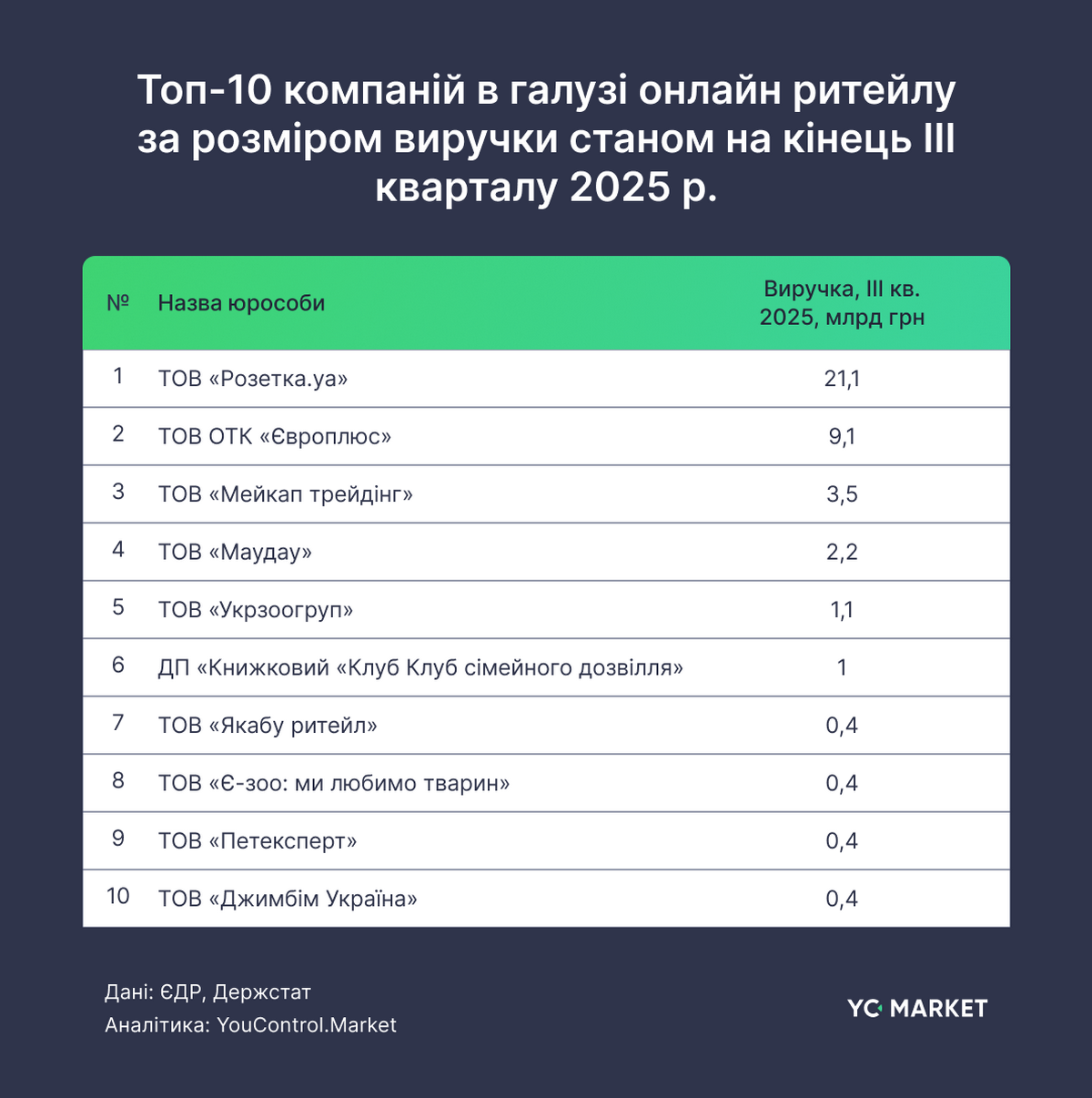 Топ‑10 онлайн‑ритейлерів за 9 місяців 2025 року заробили майже 40 млрд грн, із яких 30,2 млрд грн виручки (76%) припадає на дві компанії корпоративної групи Rozetka. Окрім універсальних маркетплейсів, до числа найбільших увійшли спеціалізовані інтернет-магазини з окремих категорій товарів. Так, одразу три компанії з топ-10 працюють у сфері зоотоварів. Окрім того, до переліку лідерів потрапили онлайн-ритейлери косметики/парфумерії, книг та спортивних товарів.