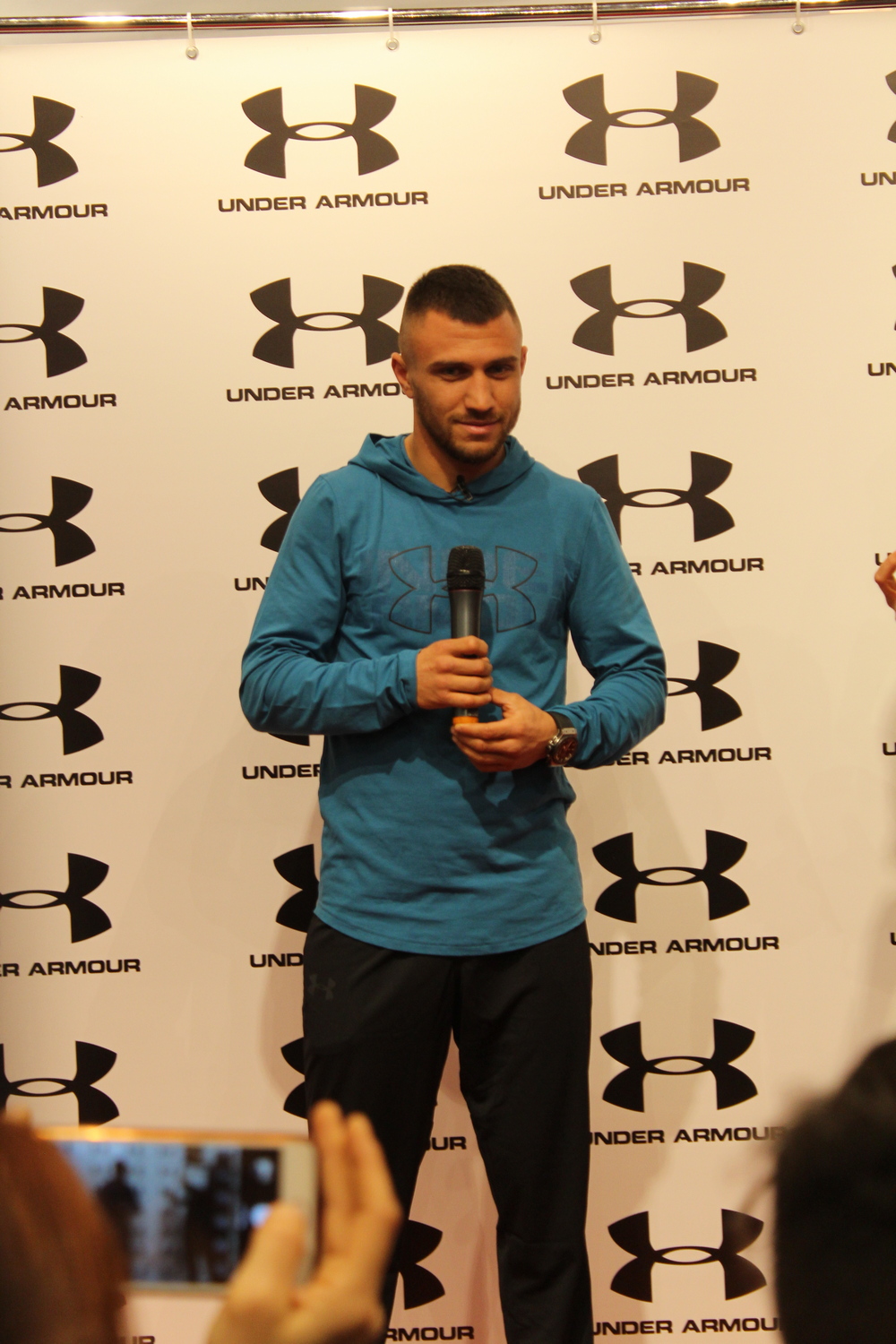 Саме Василя і попросили розрізати суворий замінник традиційної червоної стрічки: сталевий ланцюг. Що боксер успішно і зробив. За допомогою генерального менеджера Under Armour в Україні та Казахстані Клари Айсвірт.