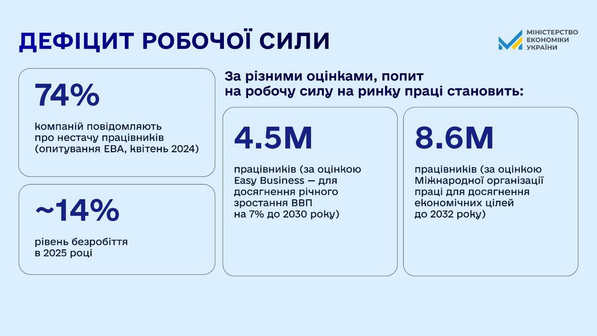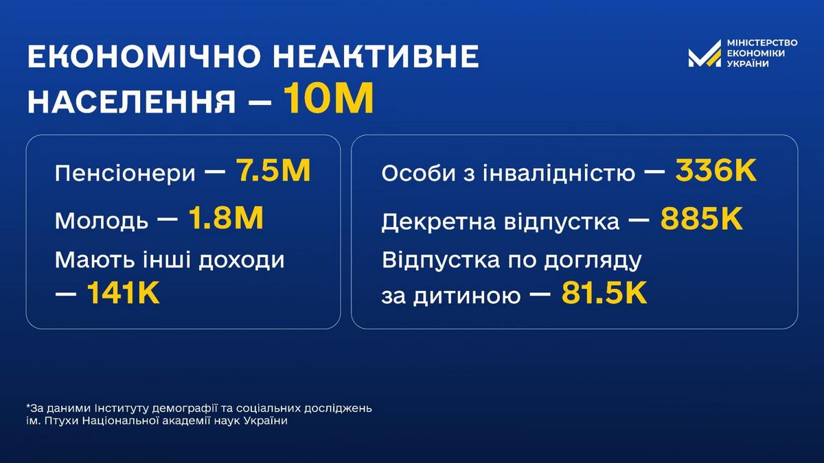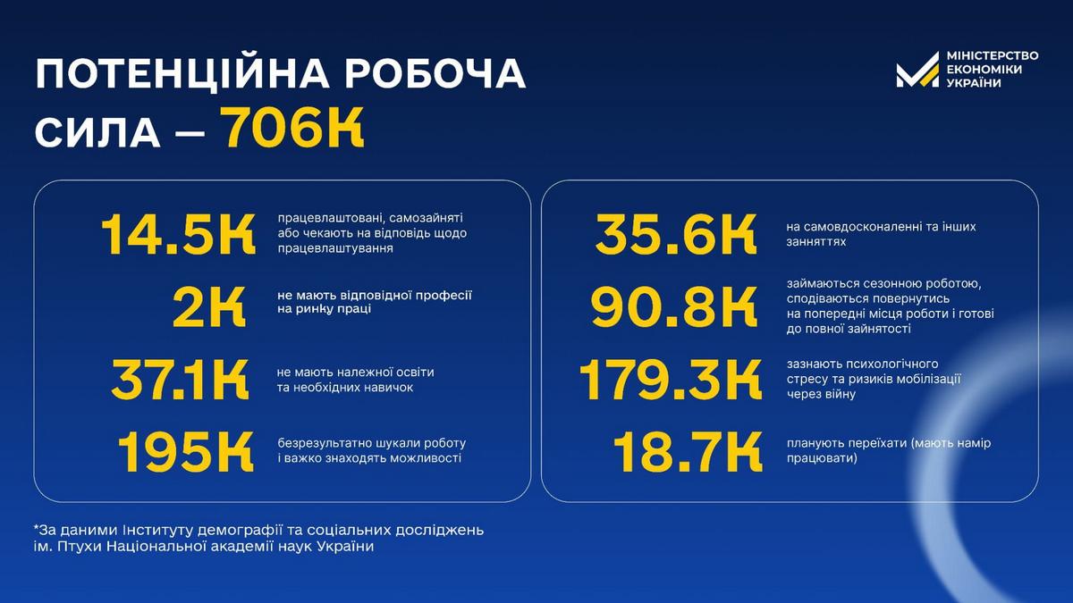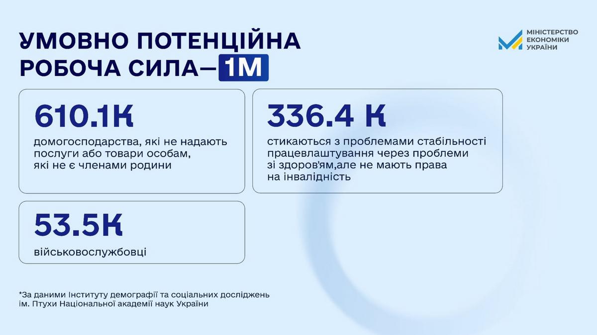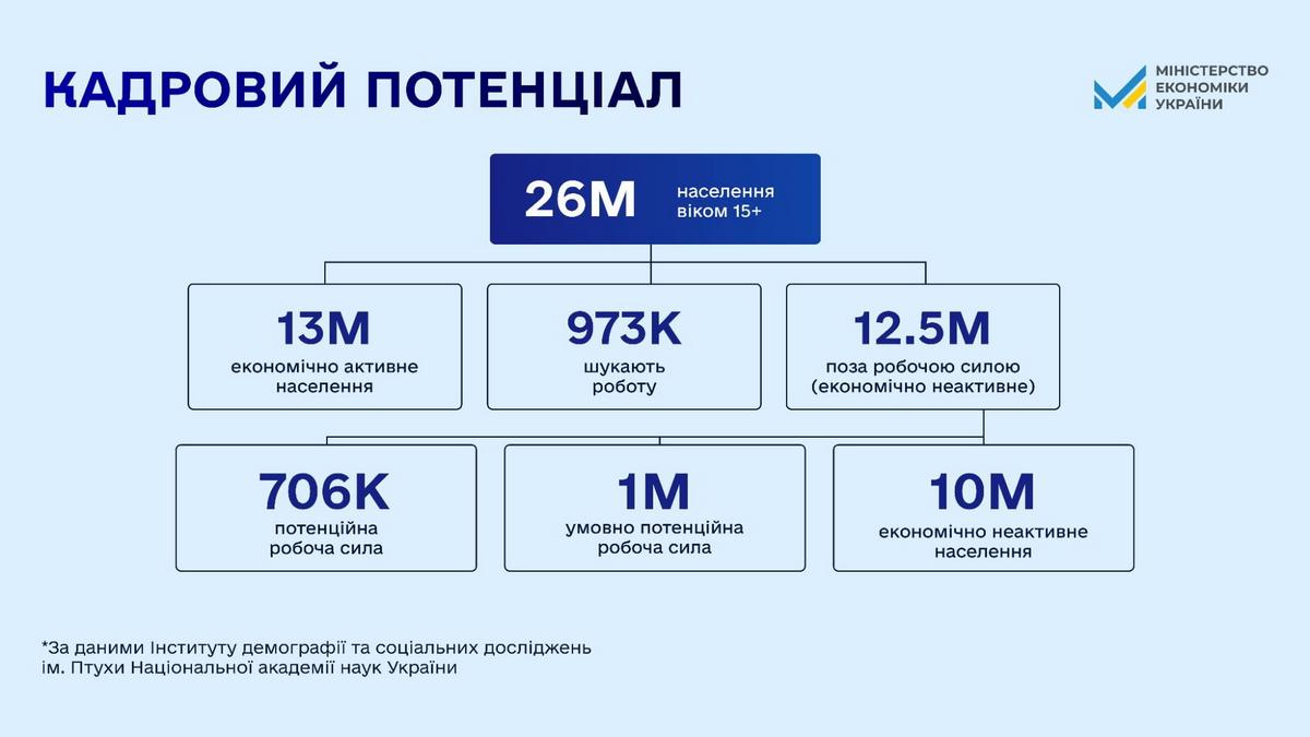 Наразі в Україні 13 млн економічно активного населення, та 10 млн – економічно неактивного (пенсіонери, молодь, яка ще не є частиною ринку праці, особи з альтернативними джерелами доходу, люди з інвалідністю, особи у відпустці по догляду за дитиною або у сімейній відпустці). Більше 700 000 людей належать до потенційної робочої сили: перебувають у перехідному періоді або не мають відповідних навичок для доступних вакансій. Також є умовно потенційна робоча сила, до якої загалом належать близько 1 млн осіб.